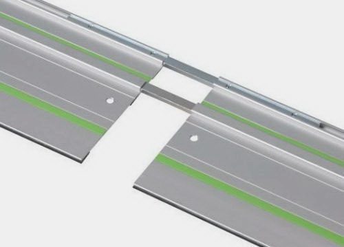 Die beiden Führungsschienen können bequem mit zwei Verbindungsstangen gekoppelt werden. Das ist wesentlich stabiler als mit nur einer Stange! So lässt sich auch die Festool-Zwinge einfach einstecken, um die Schiene sicher am Werkstück zu befestigen. Beim System 32 ist das ein Muss, beim reinen Sägen eher ein Kann.