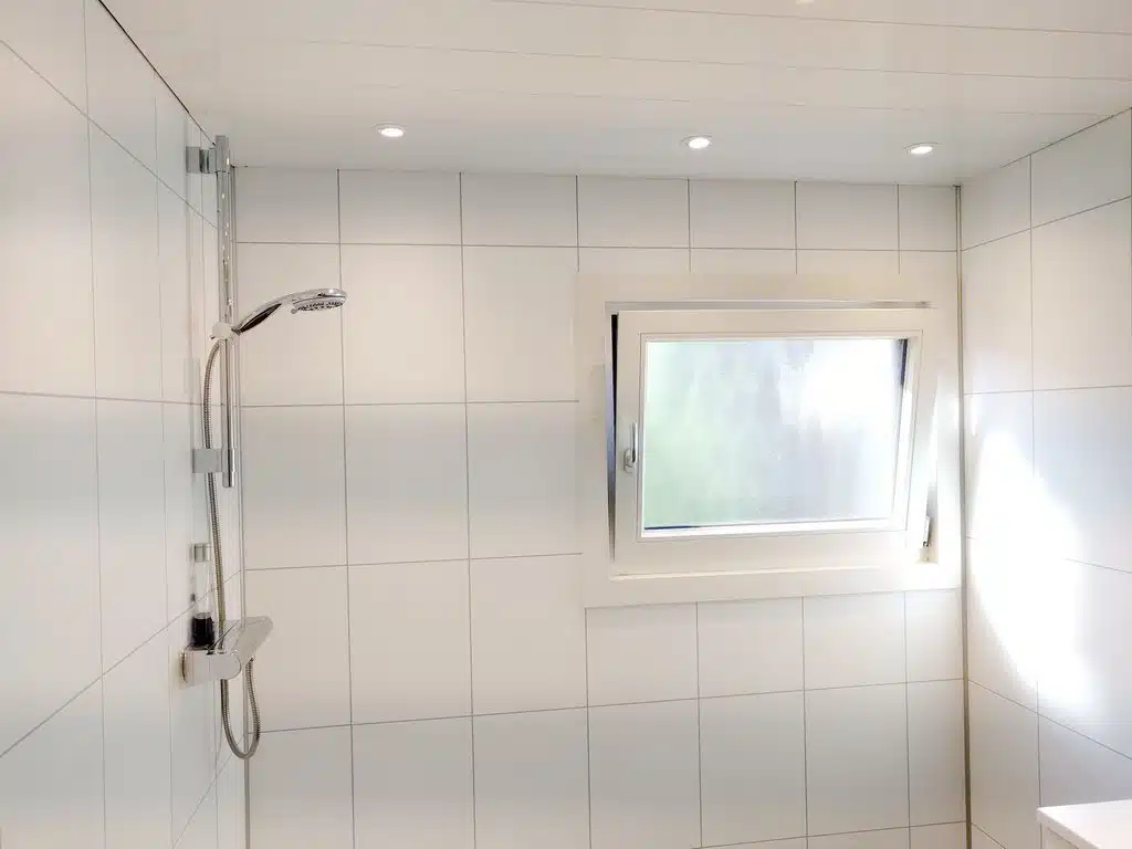 Der Boden besteht aus wasserfesten PVC-Fliesen, wobei alle Kanten fachgerecht abgedichtet wurden. Die Decke ließ sich schnell montieren – da habe ich inzwischen reichlich Erfahrung.