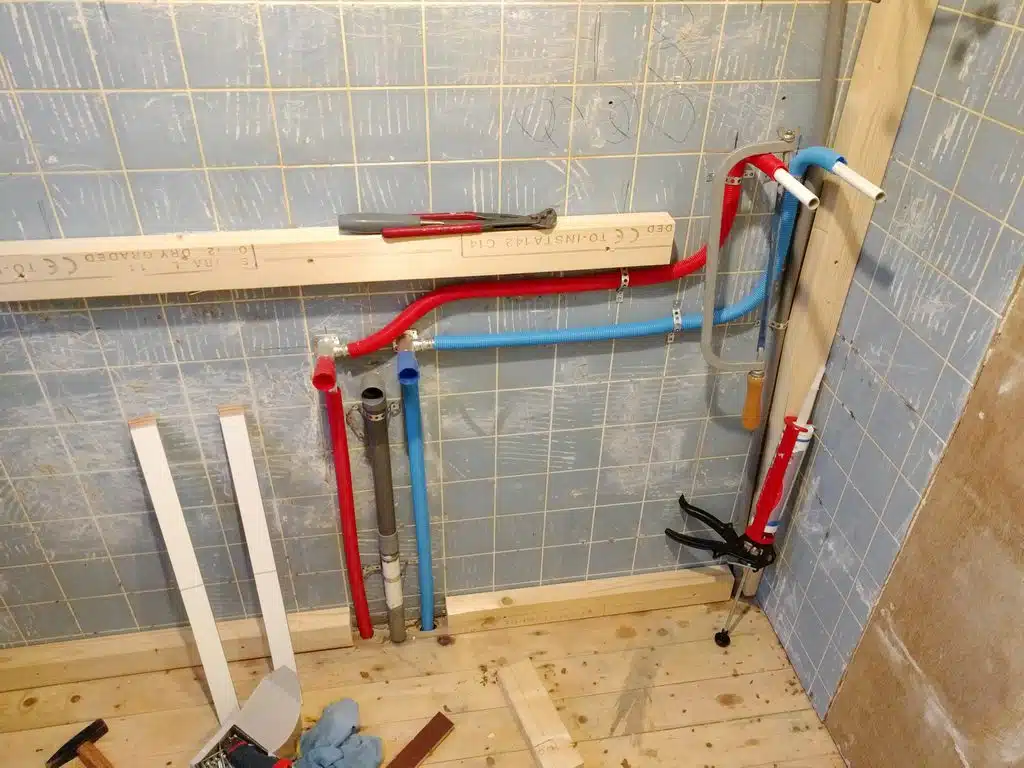 Alle Kabel und Wasserleitungen sollten „unter Putz“ verlegt werden. Daher habe ich auf der Waschtischseite eine Hohlwand gebaut, was sich mit gehobelten Latten im Format 40 × 70 mm einfach umsetzen ließ.