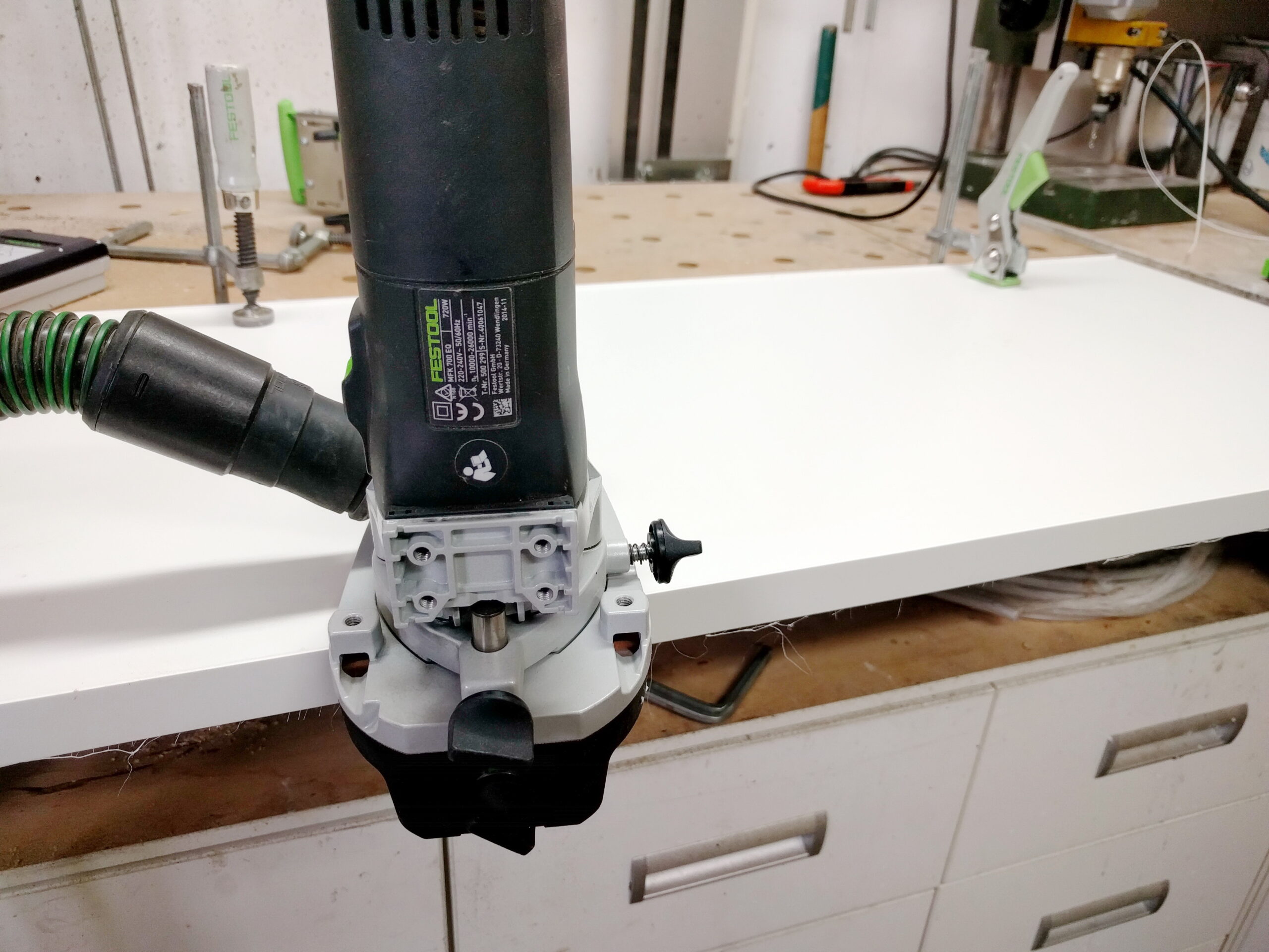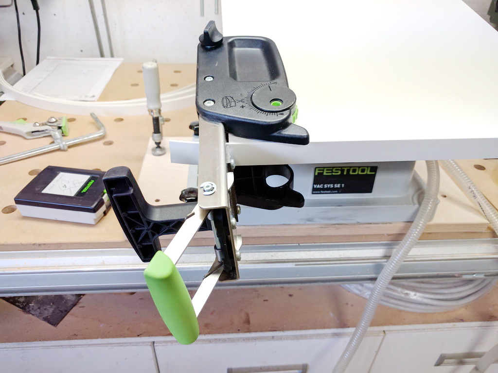 Dieses Problem habe ich mittlerweile im Griff. Ich setze die Festool MKF 700 inzwischen ausschließlich beim Verleimen von Kanten ein. Anfangs wusste ich nicht, wie sich der „Dreck“ reduzieren lässt, denn ich vertraute nur auf den Staubsauger – das war ein Irrtum.