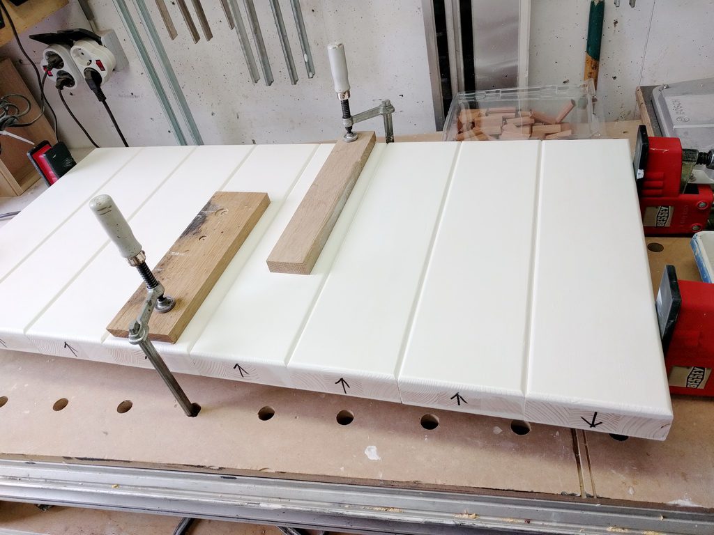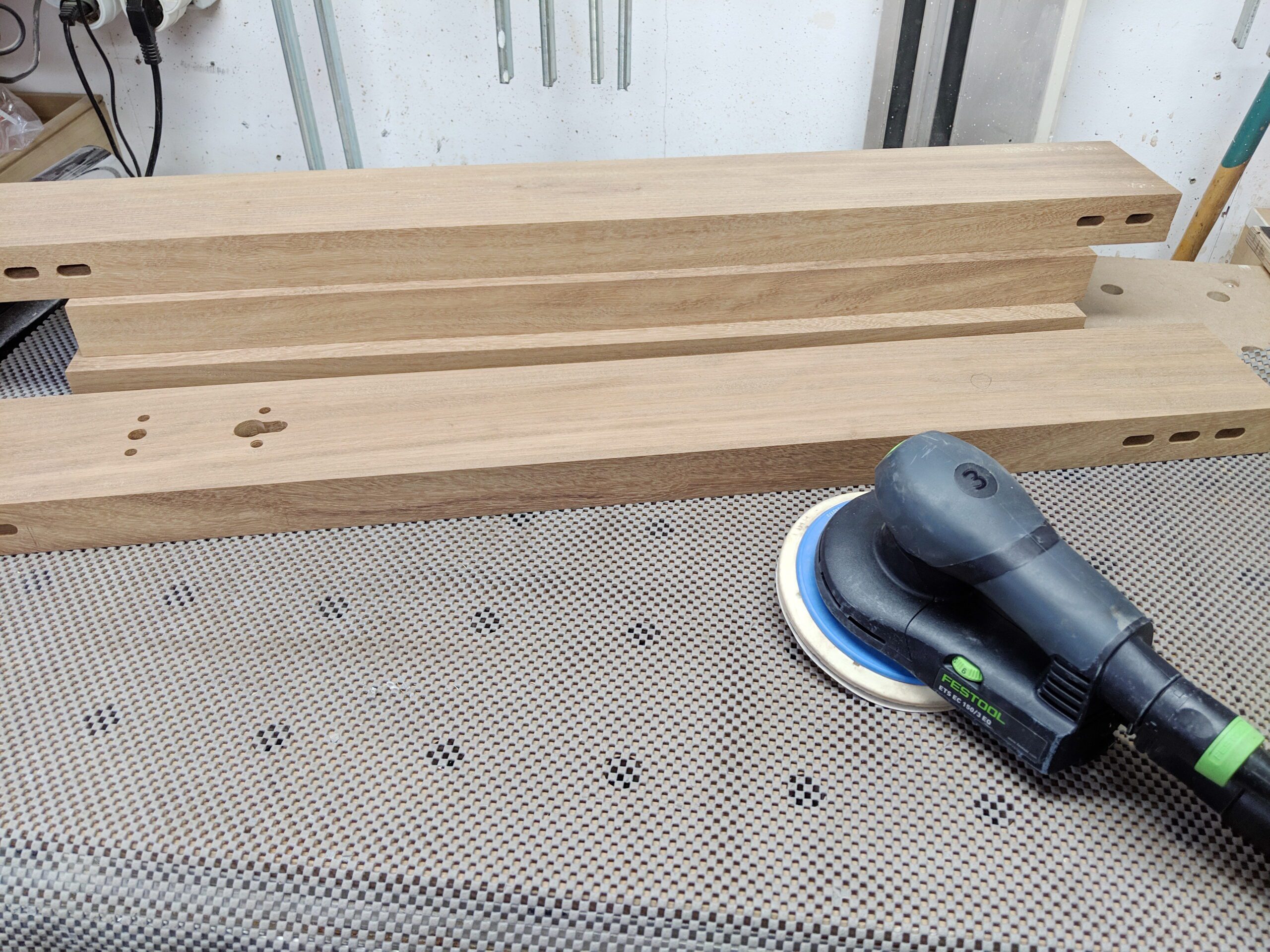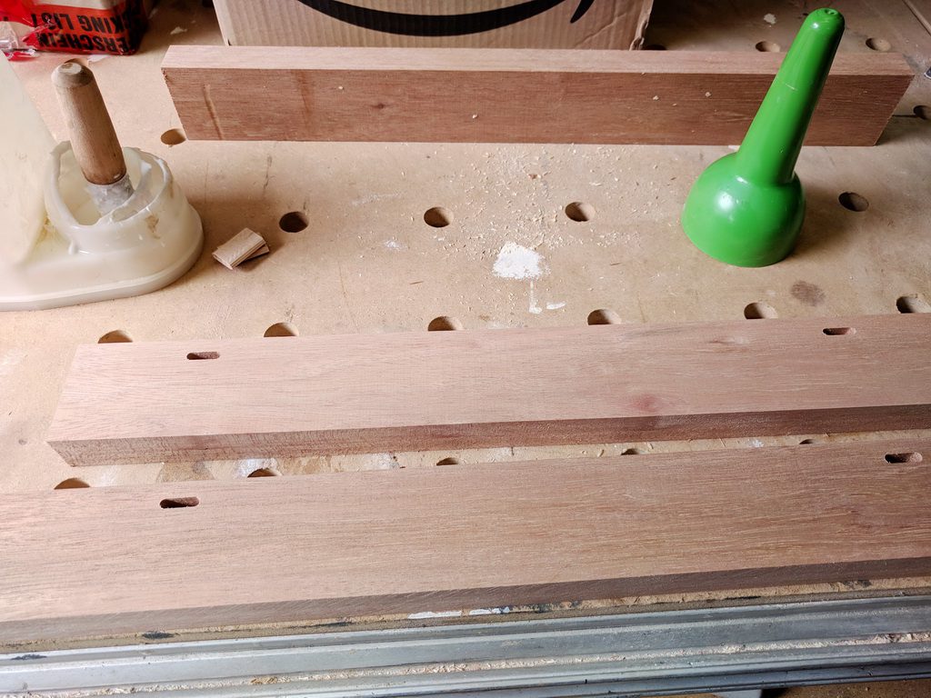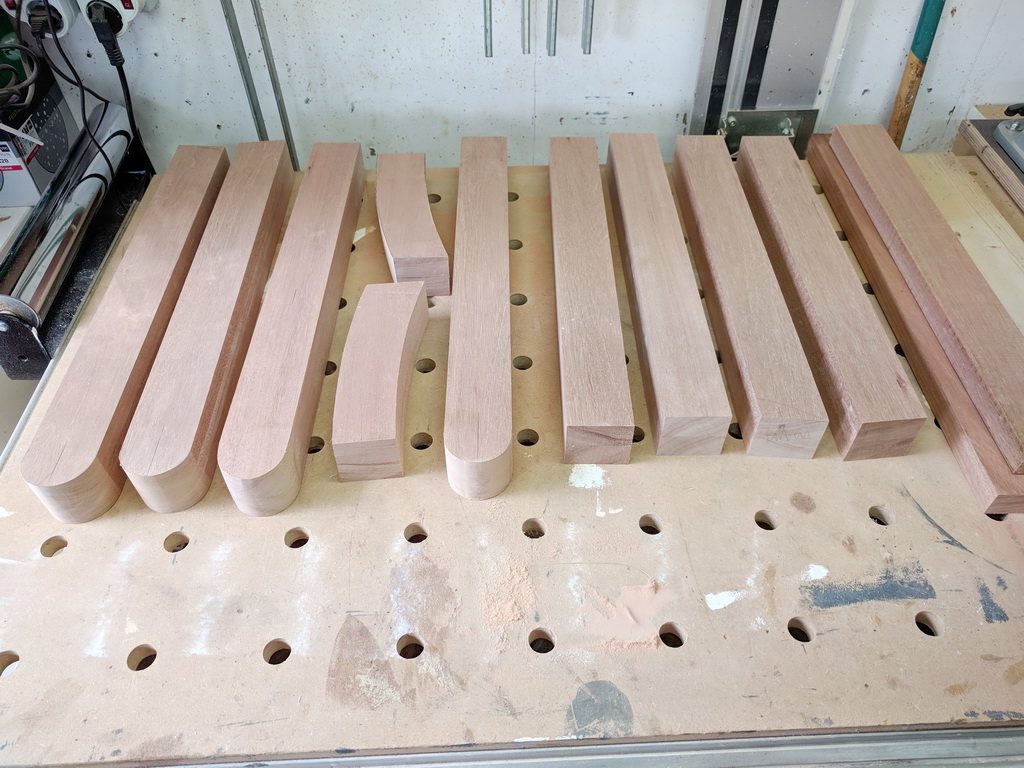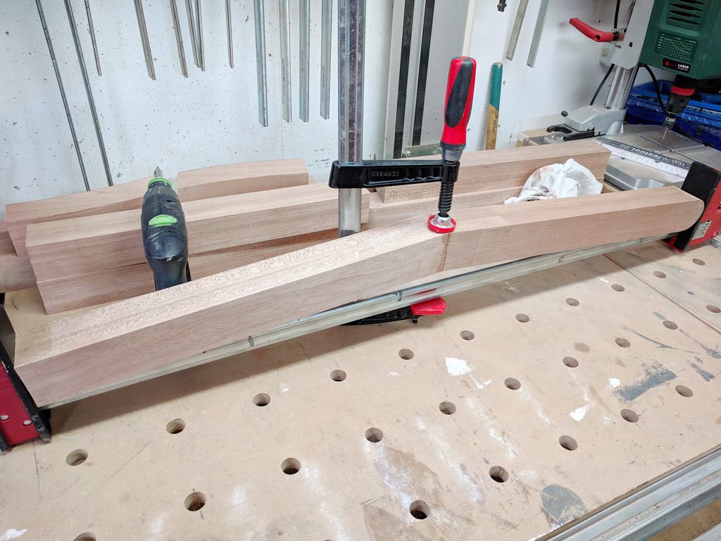 2 Elemente werden aus Vollholz hergestellt. Kambala ist sehr schwer. Trotzdem baue ich die Teile aus der kompletten Dicke won 45mm.Zunächst muss ich Leimholz herstellen. Die Teile sind bereits abgelängt, Kanten abgerundet und Holzwerbindung für die Domino-Dübel vorbereitet. Wenn die Teile gut gefügt sind, ist die Leimholzherstellung recht einfach. So habe ich die Teile auf voller Länge verleimt und unter Zwingen gesetzt.