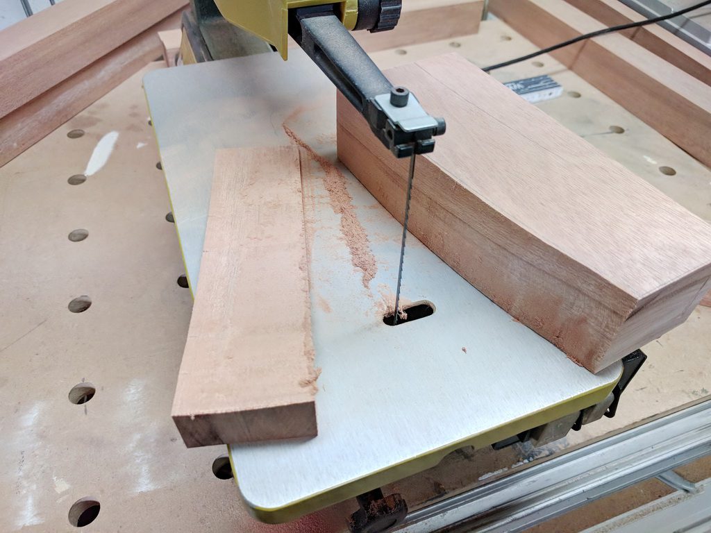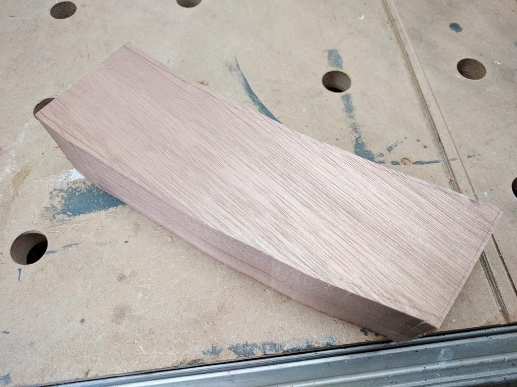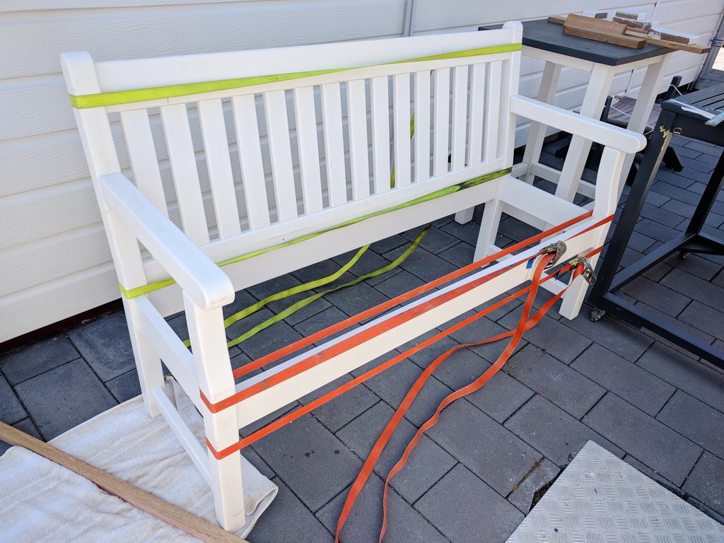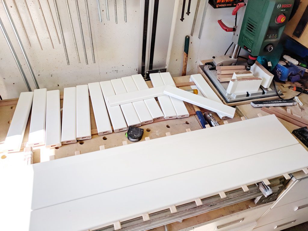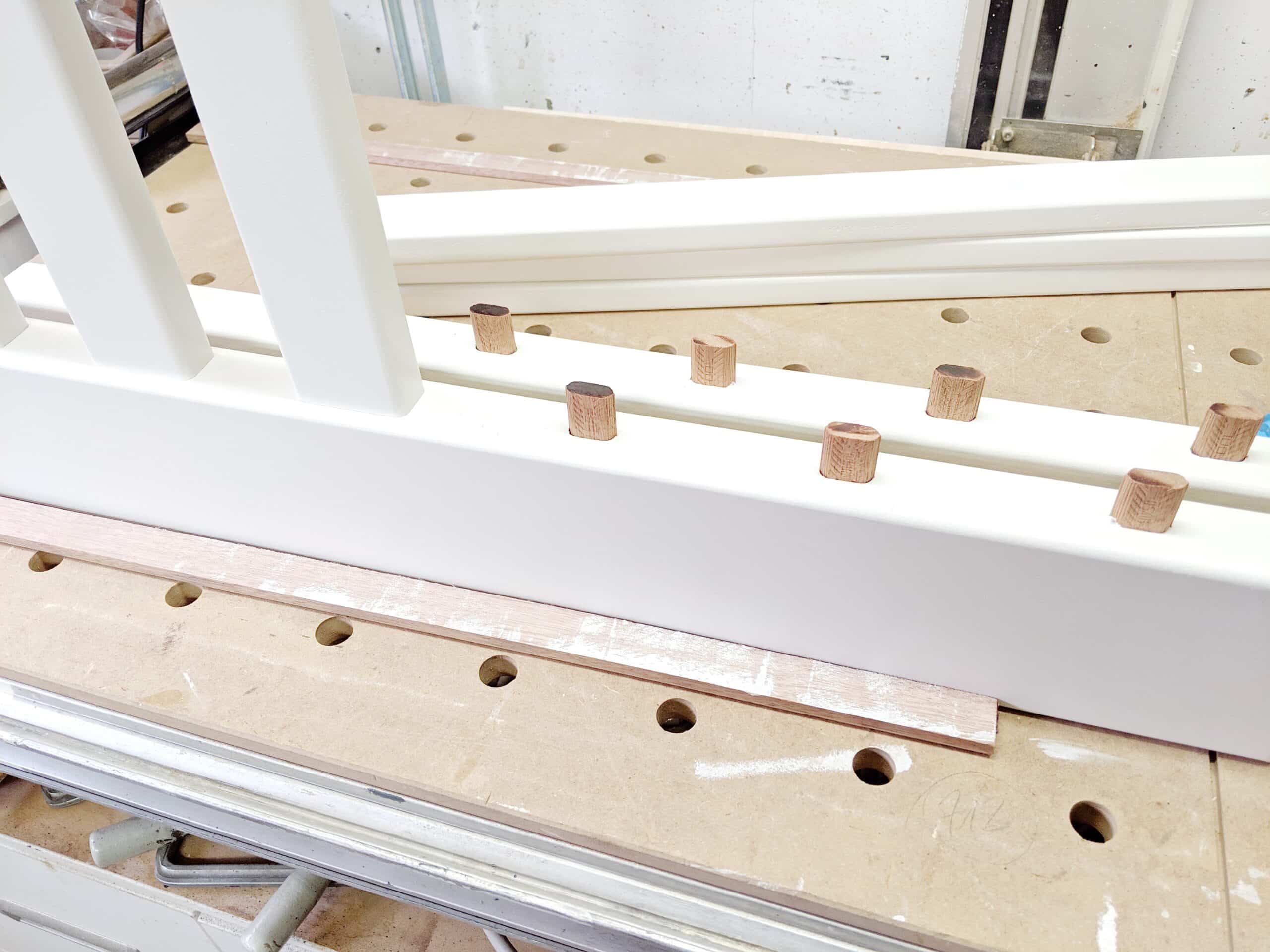 2 Elemente werden aus Vollholz hergestellt. Kambala ist sehr schwer. Trotzdem baue ich die Teile aus der kompletten Dicke won 45mm.Zunächst muss ich Leimholz herstellen. Die Teile sind bereits abgelängt, Kanten abgerundet und Holzwerbindung für die Domino-Dübel vorbereitet. Wenn die Teile gut gefügt sind, ist die Leimholzherstellung recht einfach. So habe ich die Teile auf voller Länge verleimt und unter Zwingen gesetzt.