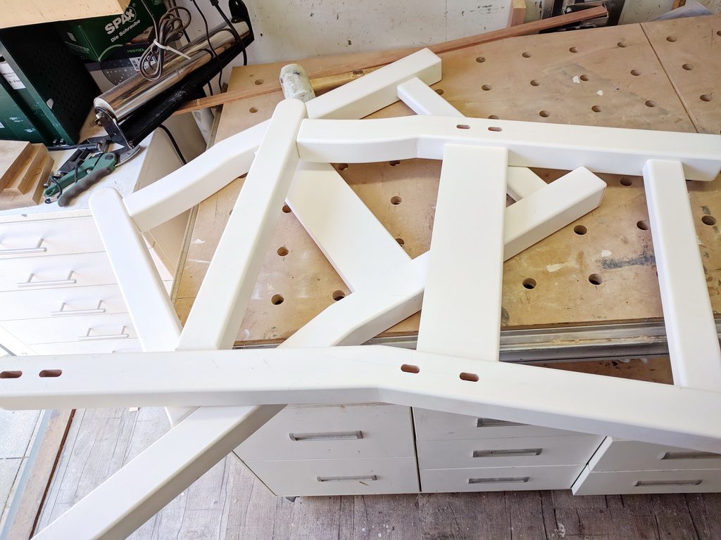 Die Holzverbindungen sind Festool-Domino-Dübel. Besser wäre eine Überblattung gewesen. Doch Einfachheit und Faulheit haben gesiegt. Heute würde ich das so nicht mehr machen.