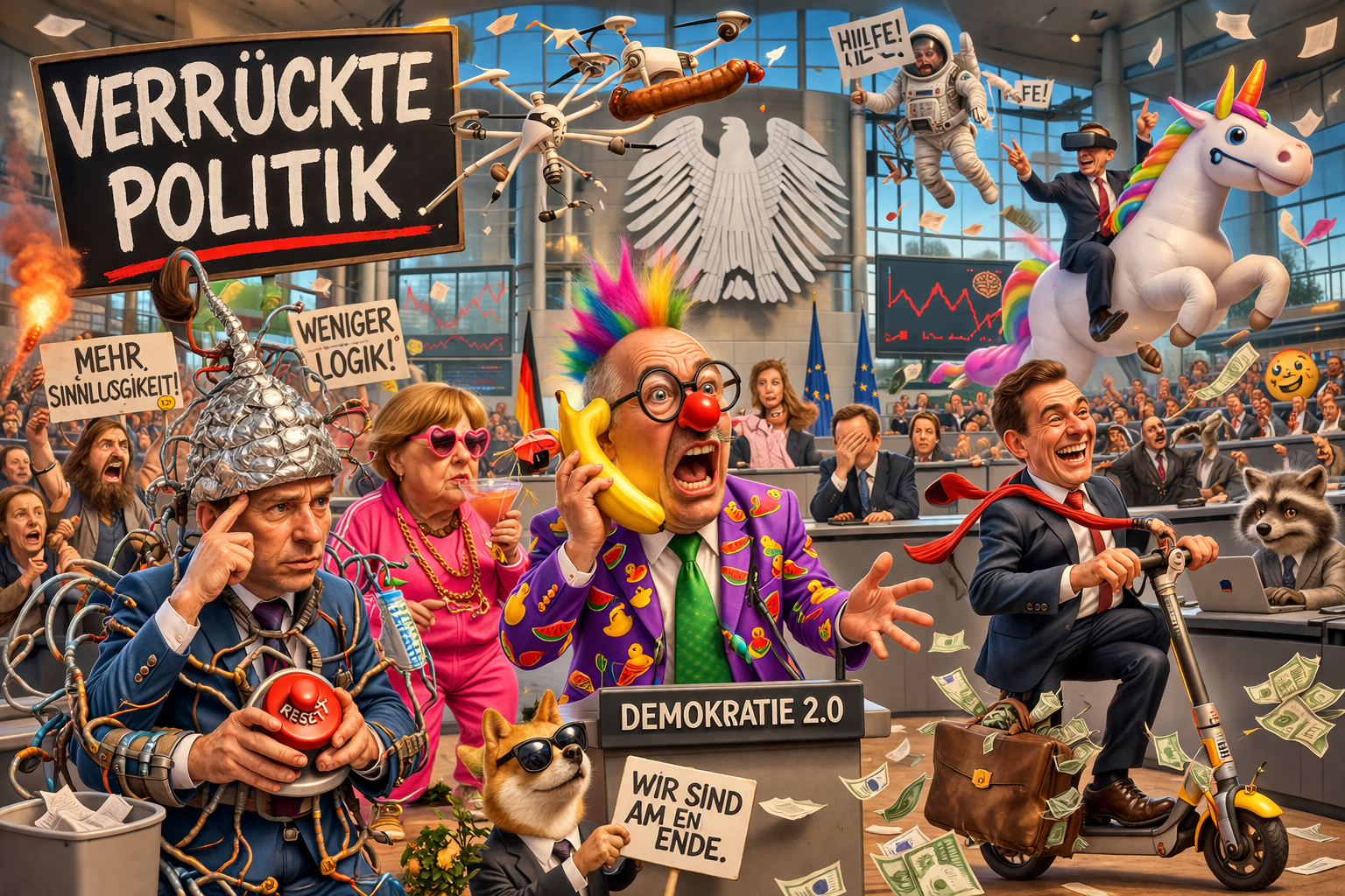 Das Ergebnis zeigt eine zugespitzte, bewusst überspitzte Sicht auf politische Strukturen und gesellschaftliche Entwicklungen, wie sie in meiner Anfrage angelegt waren. Die Darstellung wirkt chaotisch, überladen und spiegelt ein Gefühl von Einflussnahme und Komplexität im politischen Alltag wider.