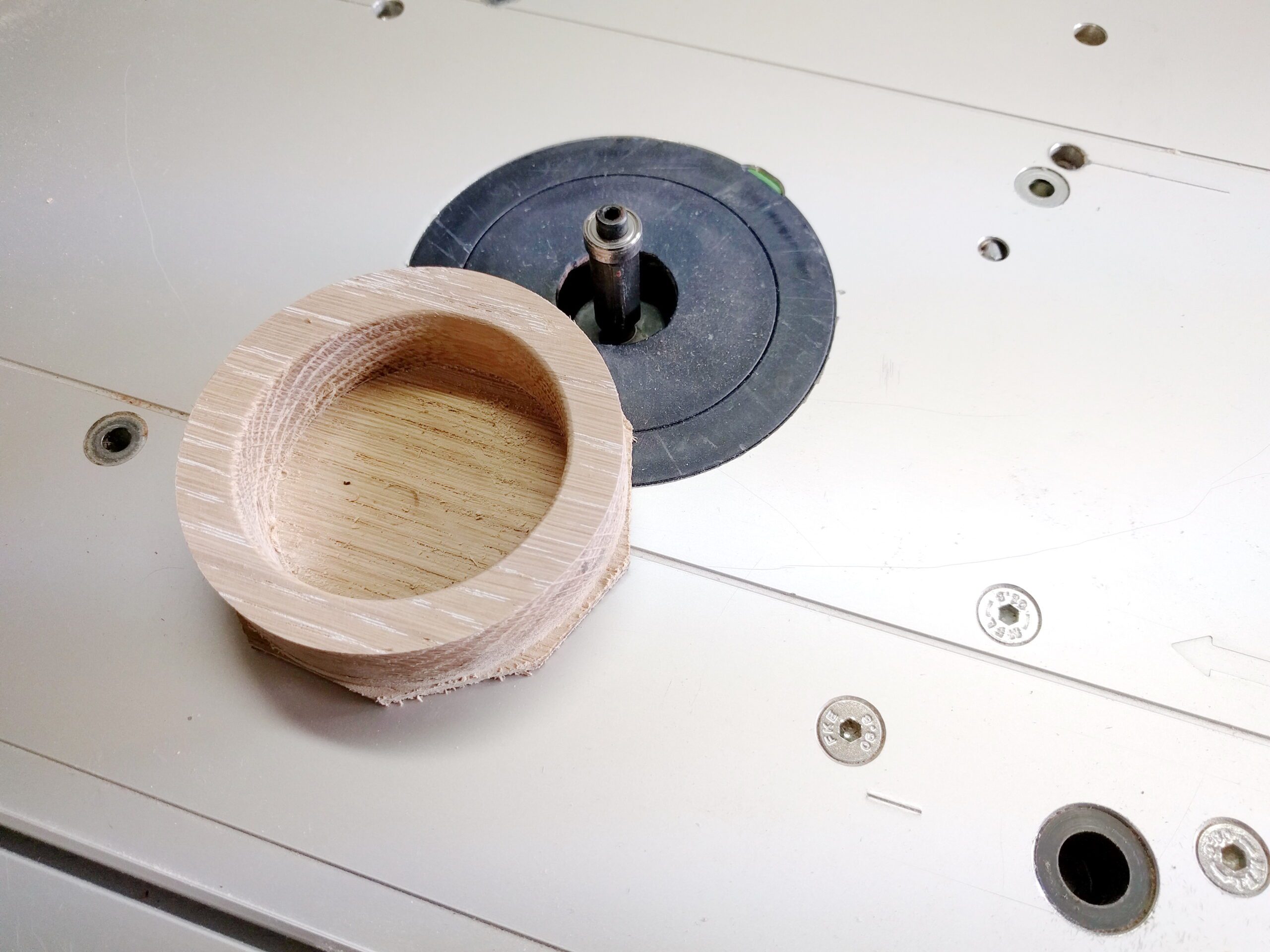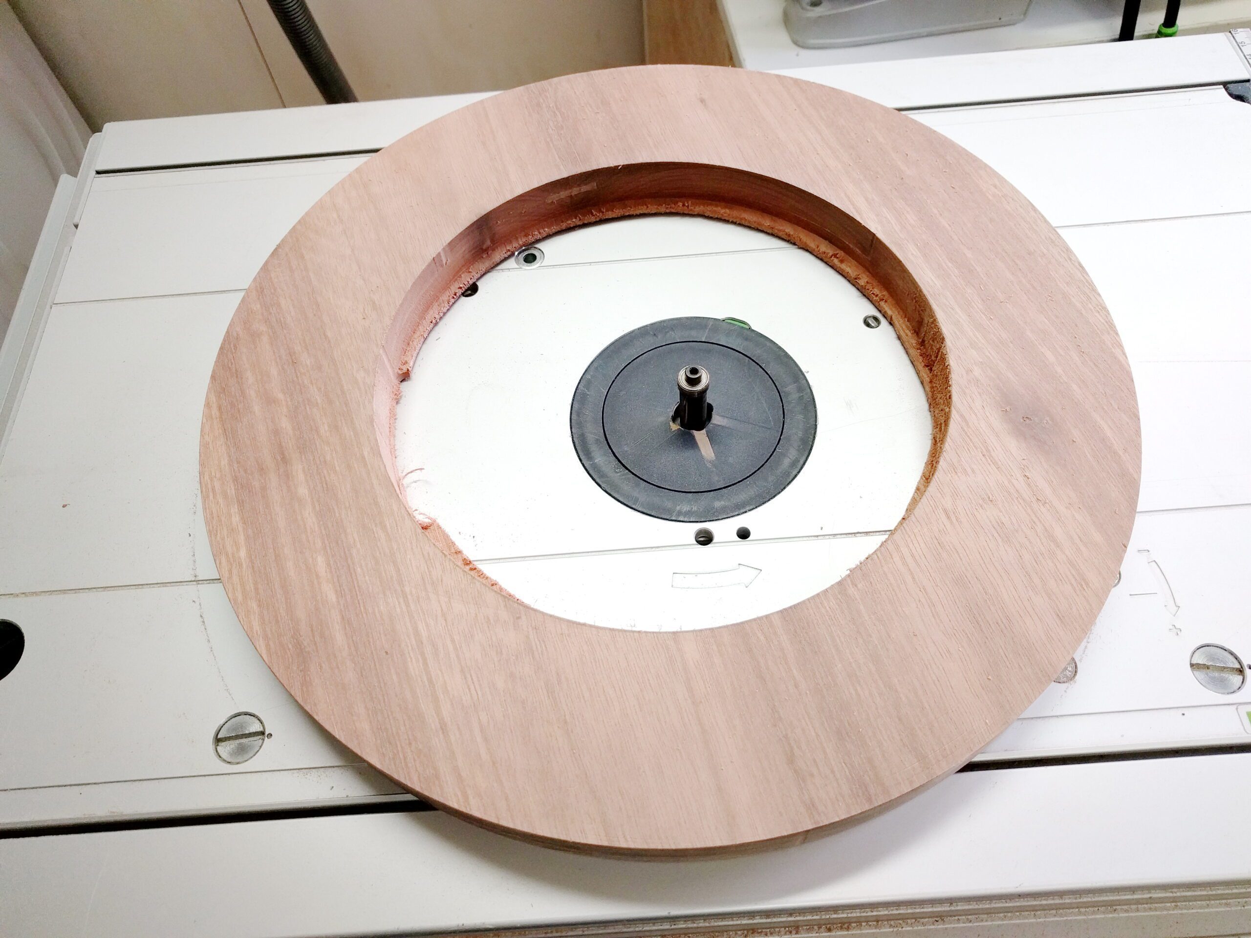 Mit der Festool Frässchablone, mit der man auch Kreise fräsen kann, habe ich das maximale Maß eingestellt und mit der Oberfräse in mehreren Gängen gefräst.