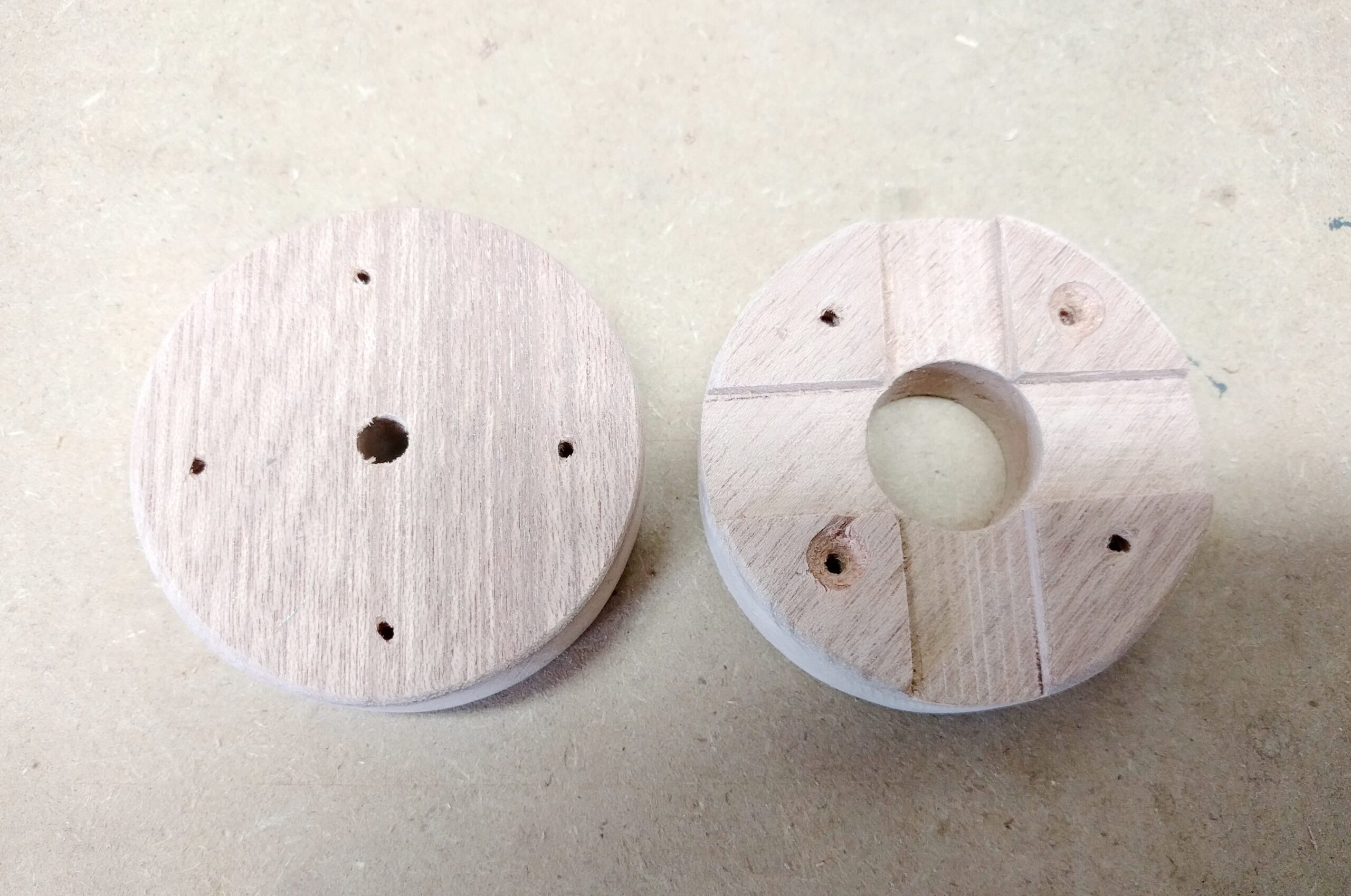 Der Adventskranz wird auf Gummifüßen stehen. Kleine Einsteckgummis, die eine Bohrung benötigen.