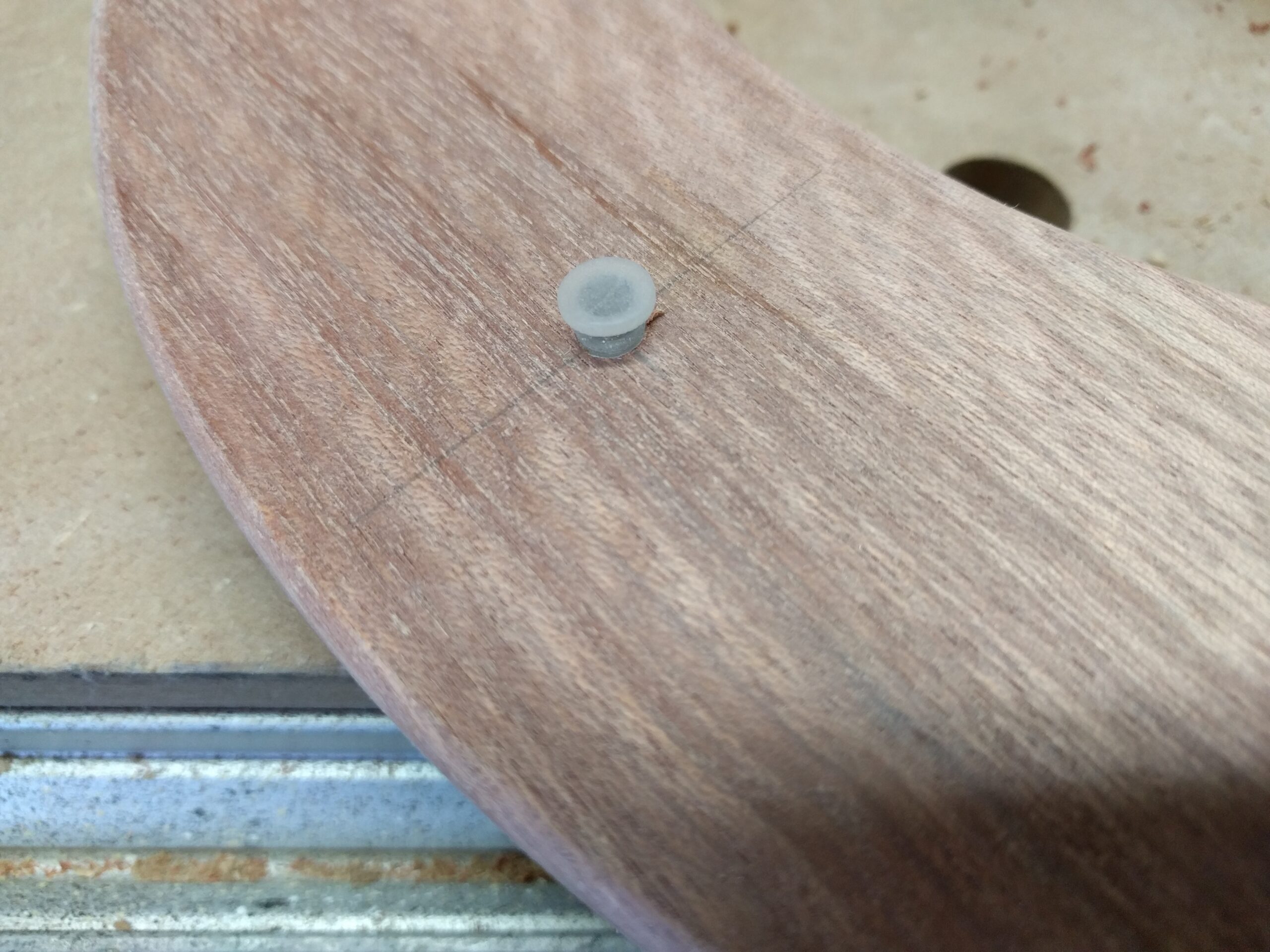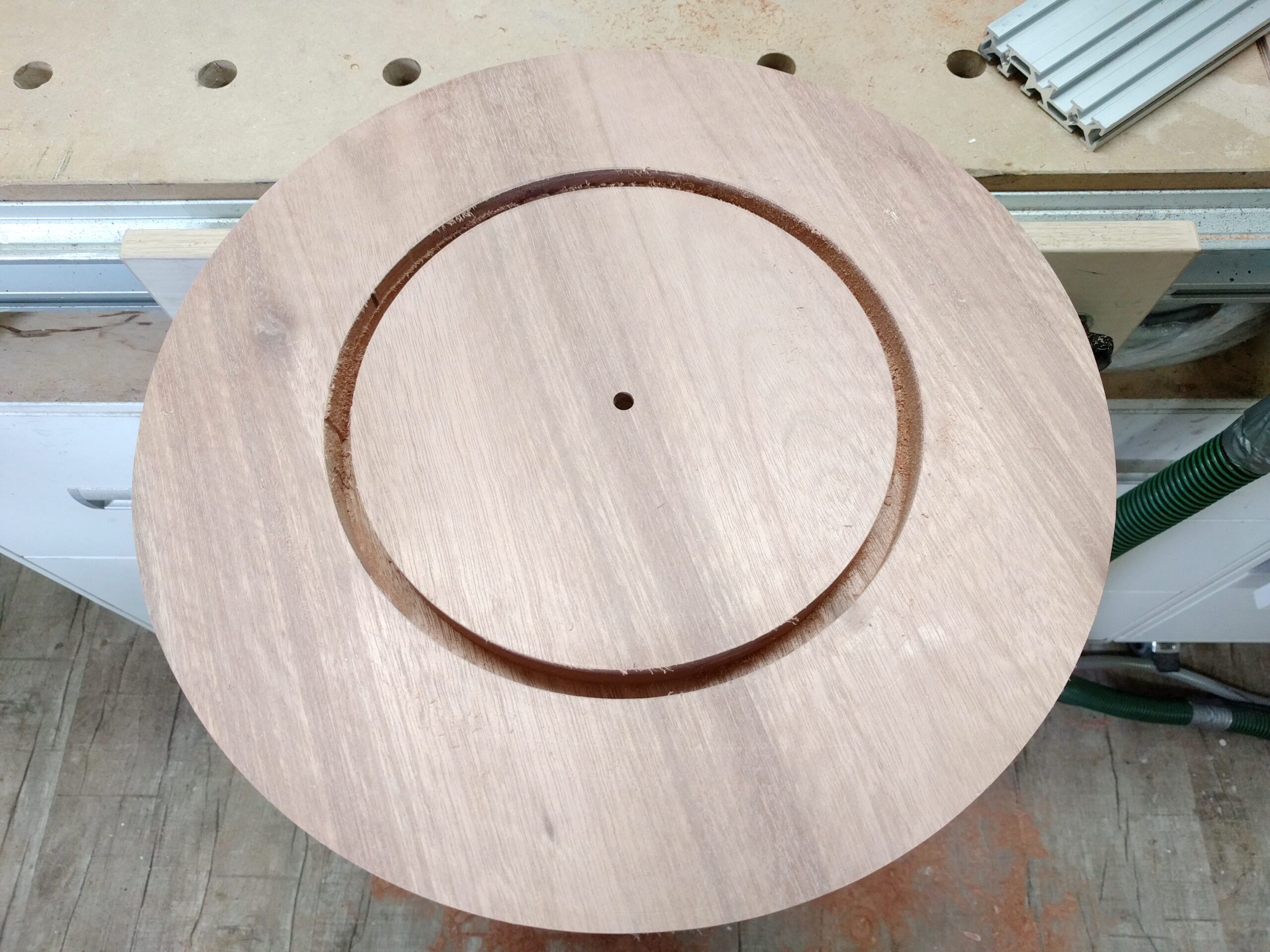 Die Scheibe fräse ich nicht komplett aus sondern nur die Stärke des Brettes - 1mm um das Material nicht zu beschädigen.