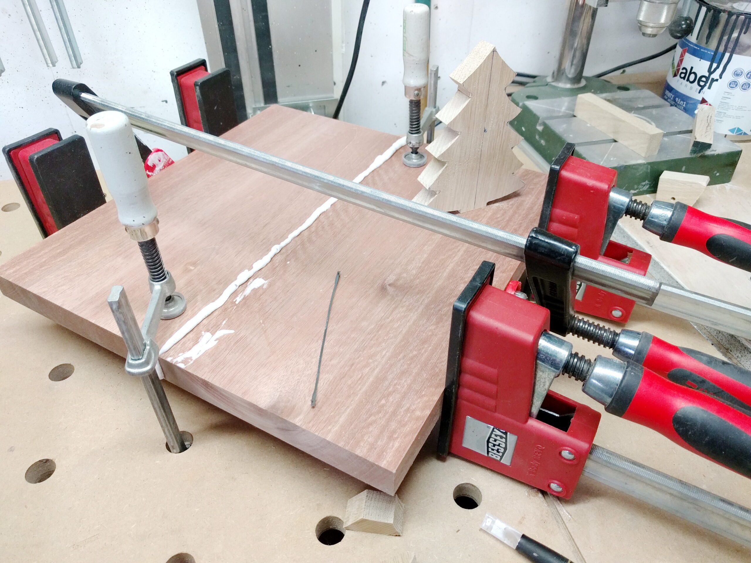 Die Kanten sind gefügt und mit Dominos zum Verleimen zentriert. Zwingen sorgen für eine sichere Verleimung.