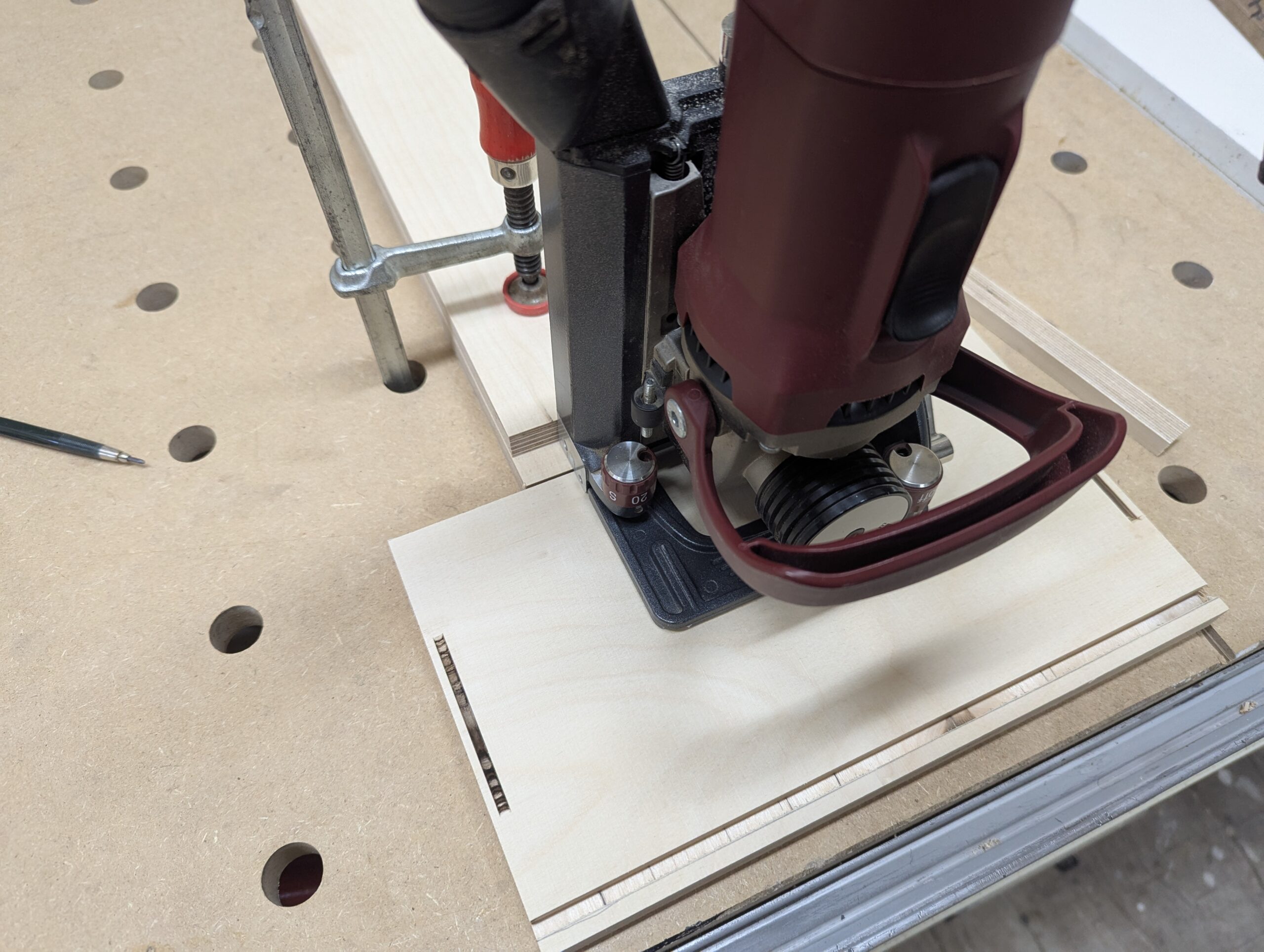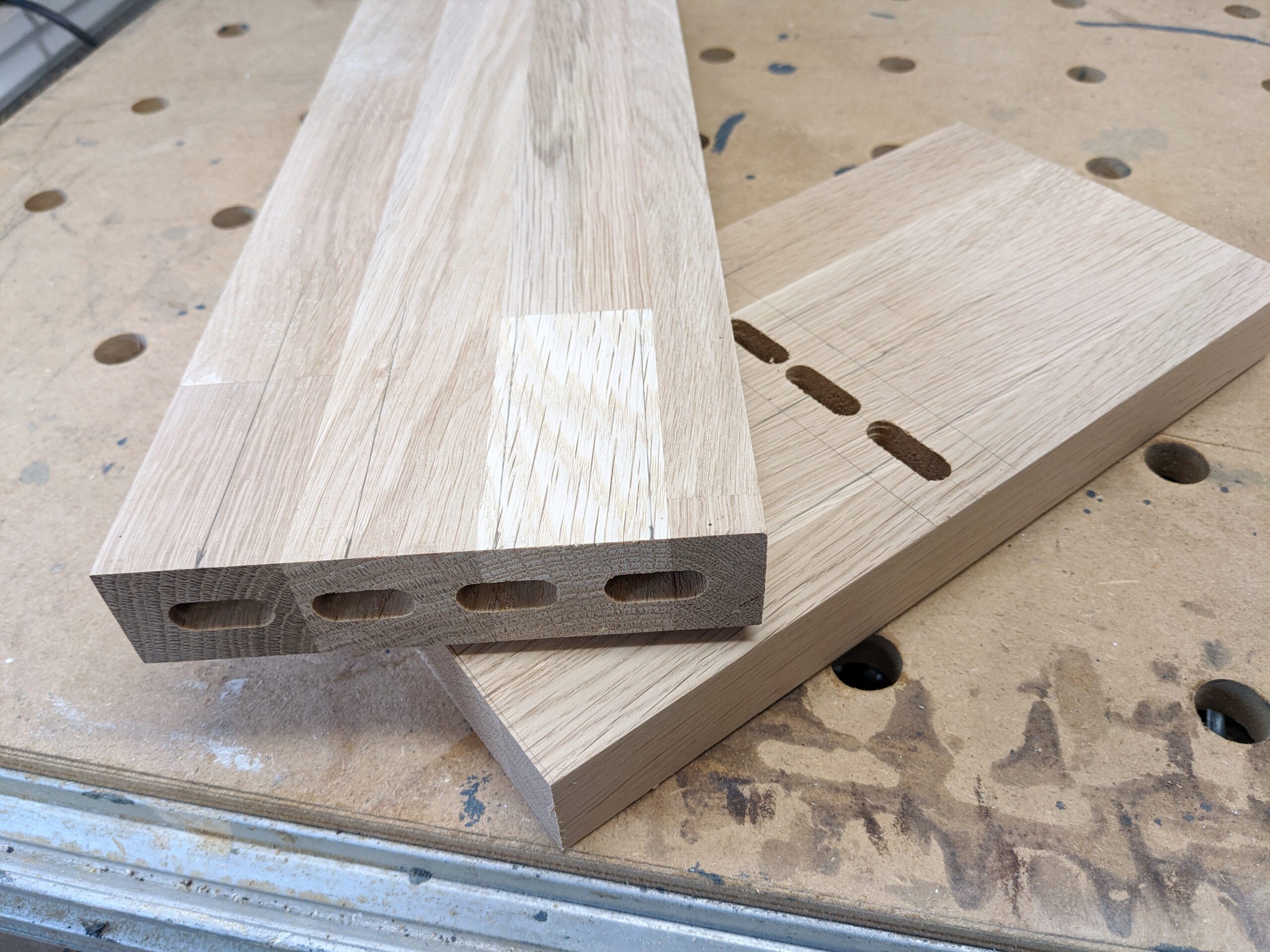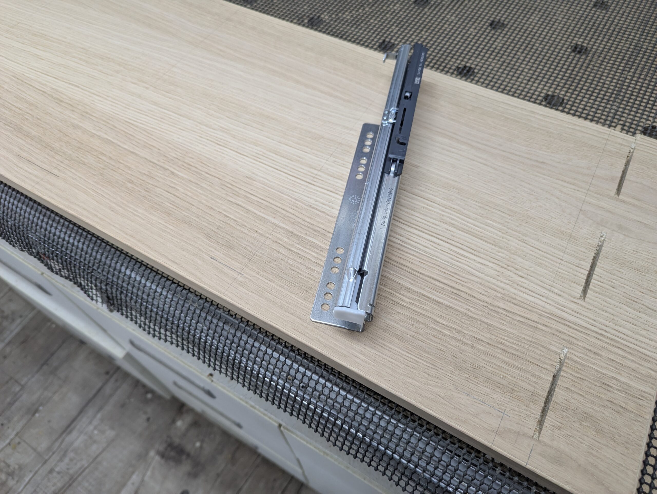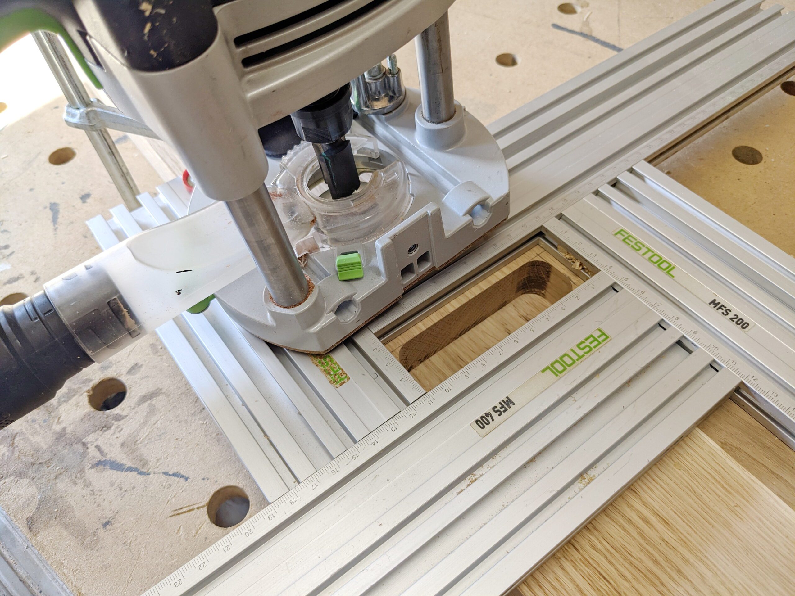 Die Schienen brauchen eine Nut um versenkt zu werden. Hierzu habe ich 2 x pro Reihe gefräst. Zuerst die tiefe Nut und anschließend die Flache für den Rand der Schiene.