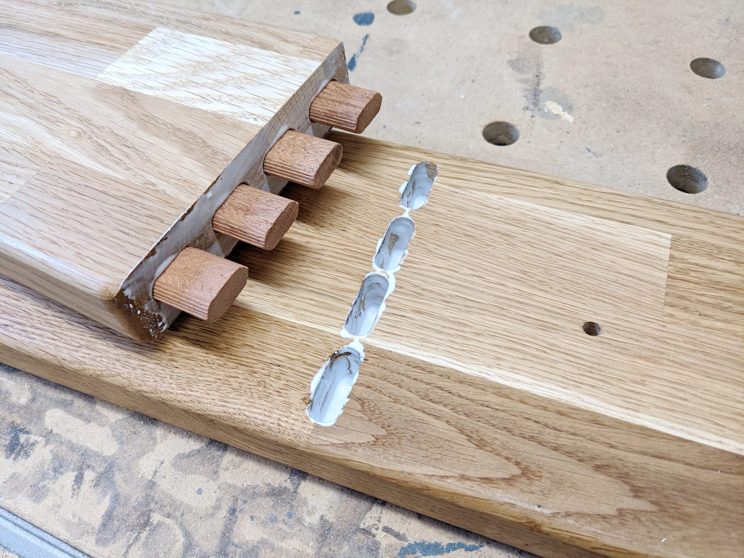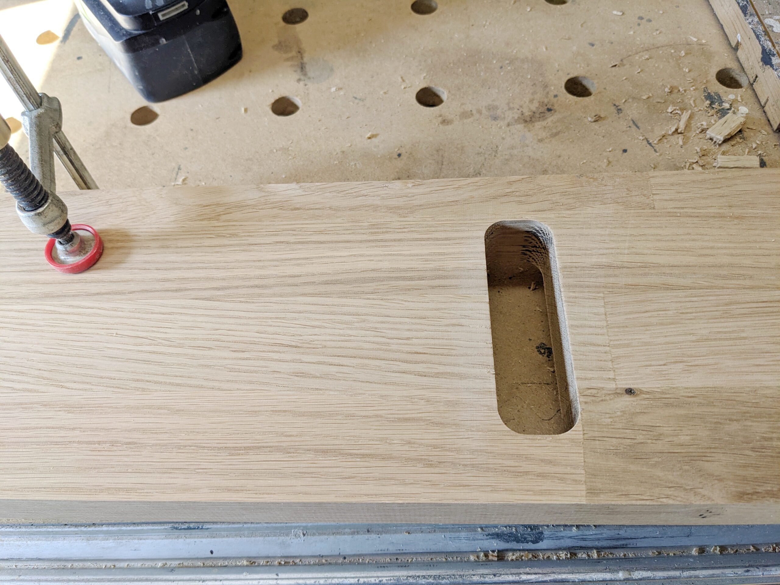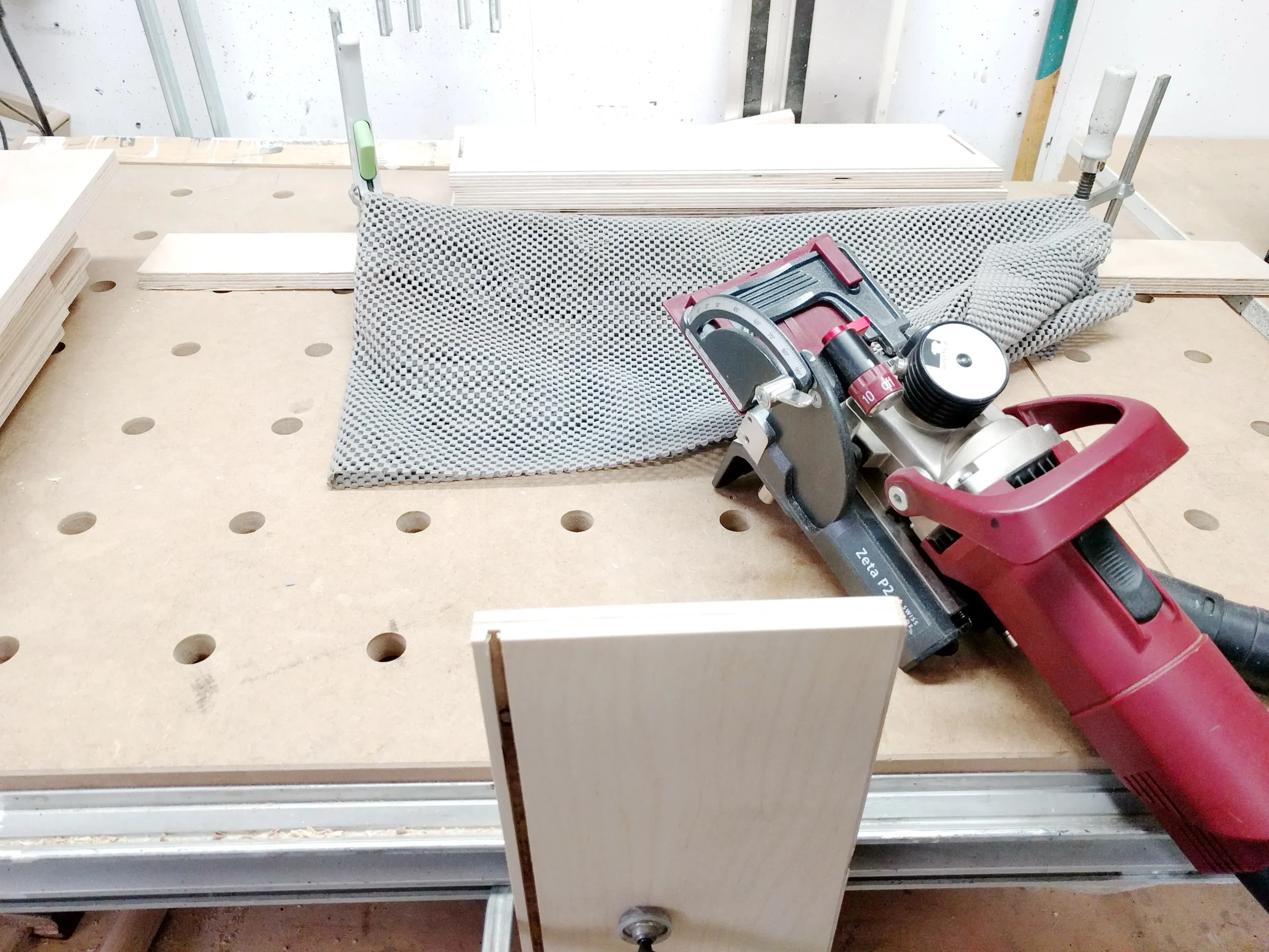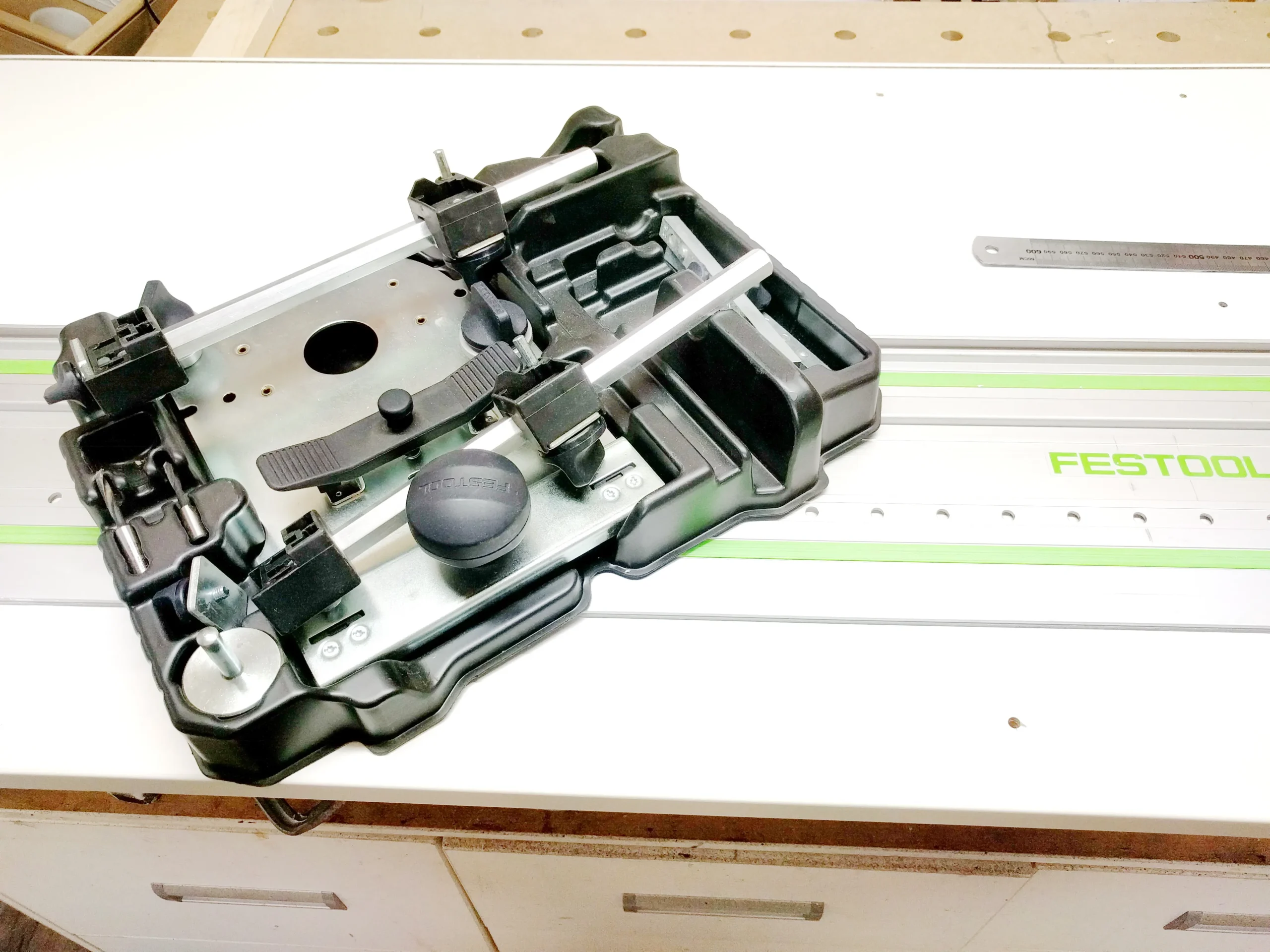 Die Schienen brauchen eine Nut um versenkt zu werden. Hierzu habe ich 2 x pro Reihe gefräst. Zuerst die tiefe Nut und anschließend die Flache für den Rand der Schiene.