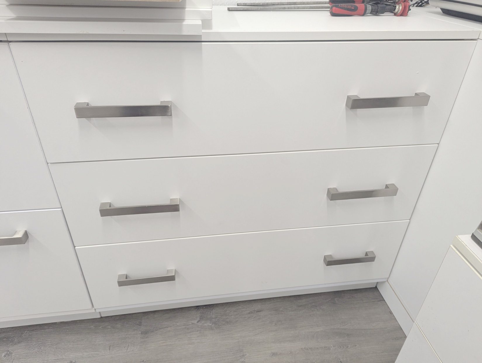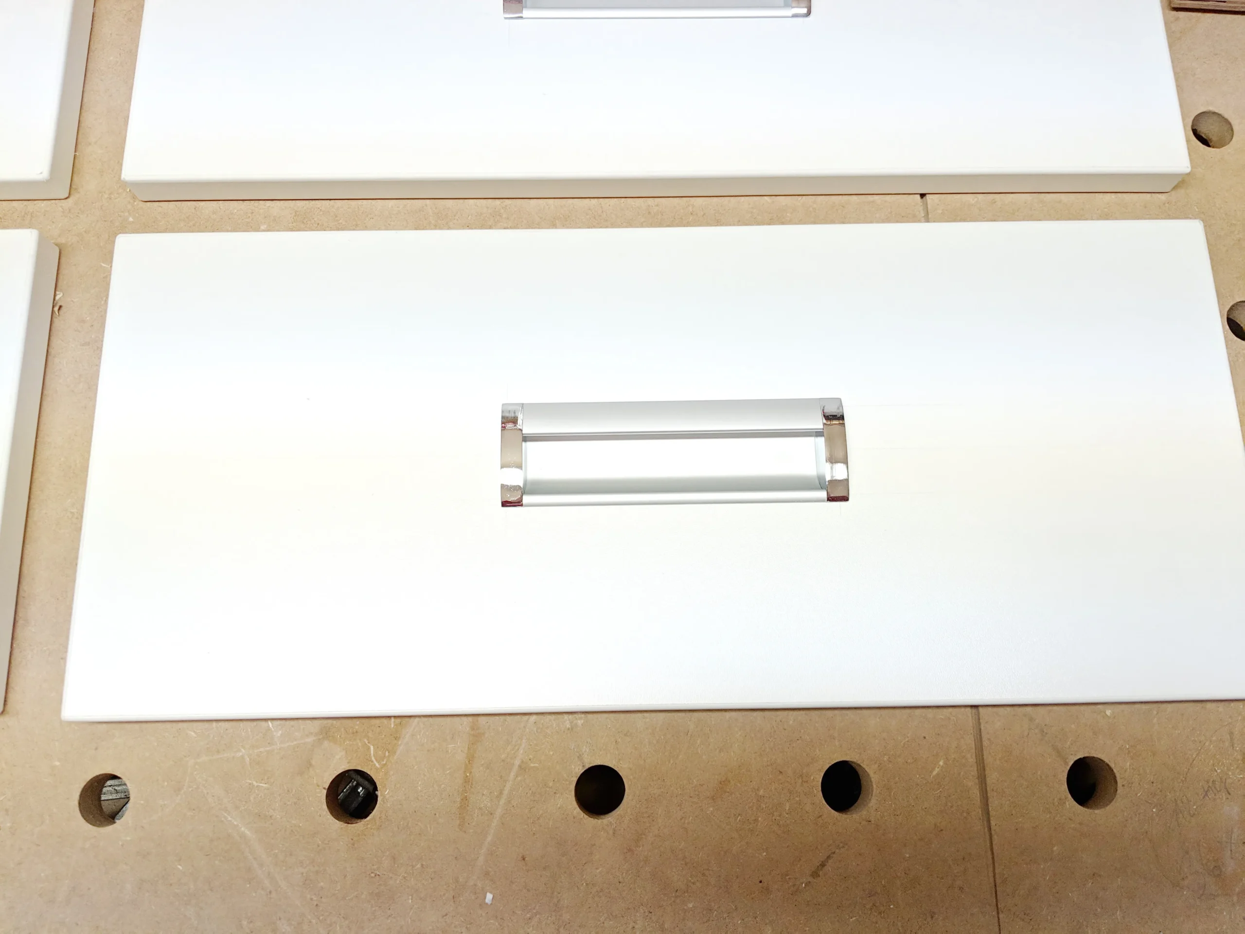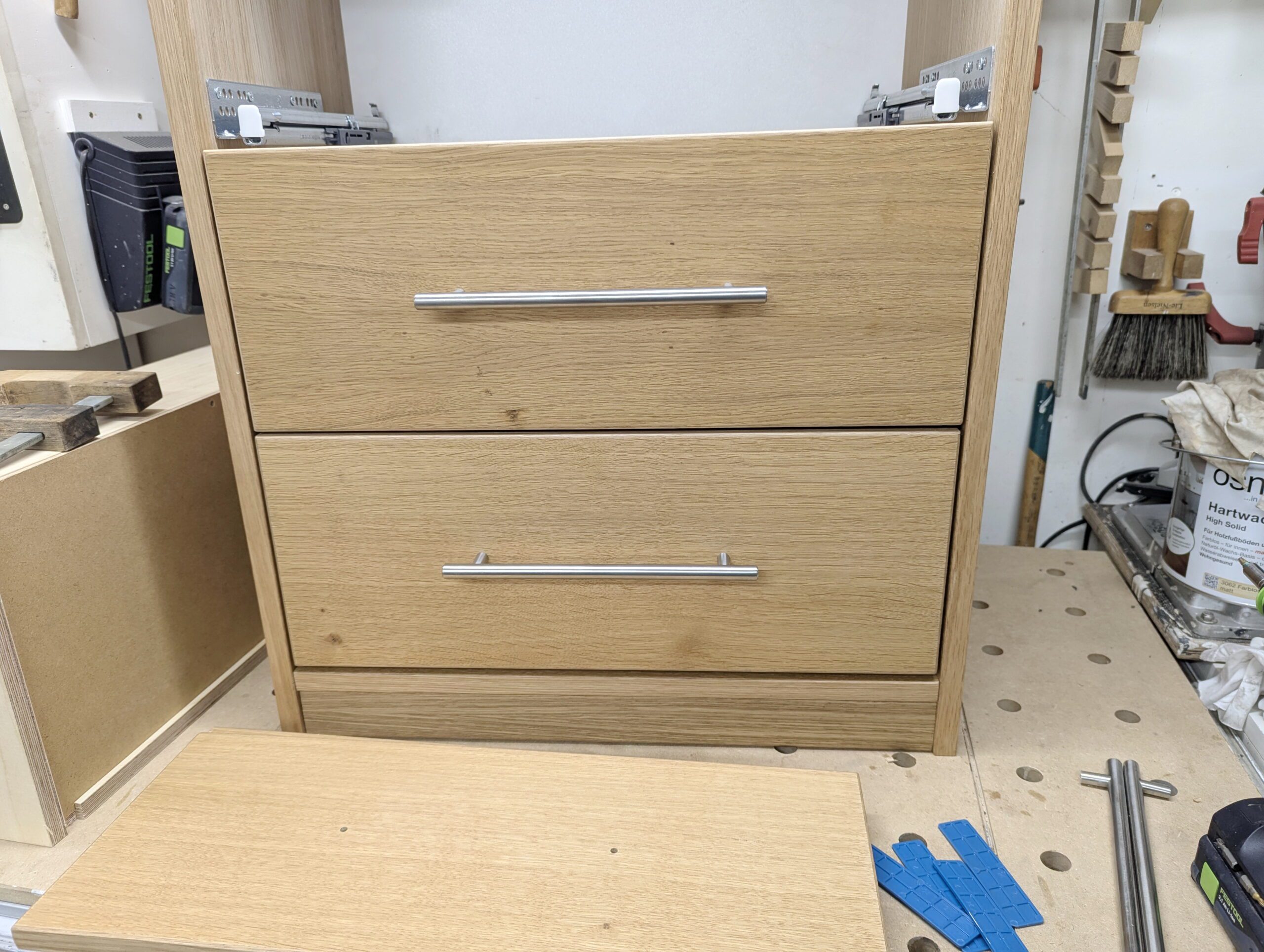 Auch die Griffe habe ich anschließend schon angebracht, denn im zusammengebauten Zustand komme ich an die Schrauben nicht mehr von hinten ran.