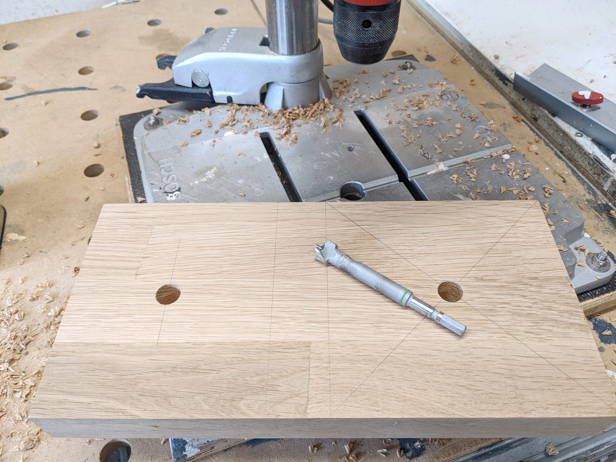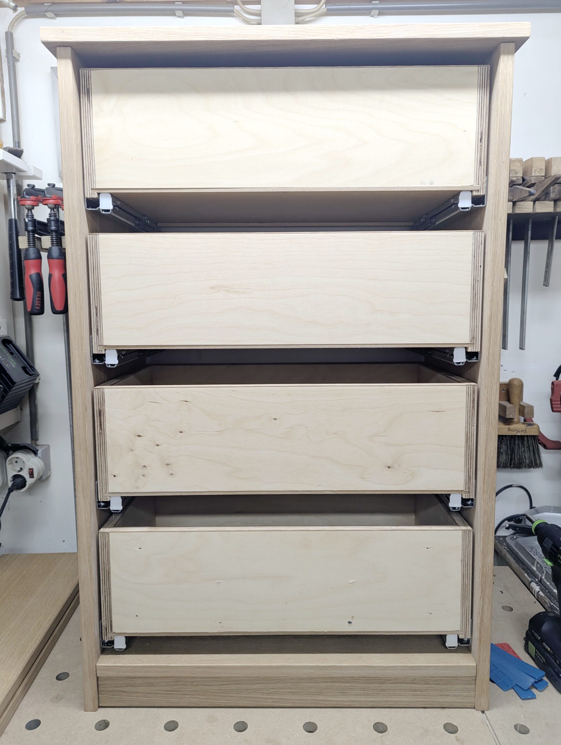 Da ich noch genügend eichefurnierte Spanplatte habe, werde ich diesen Schrank daraus bauen.