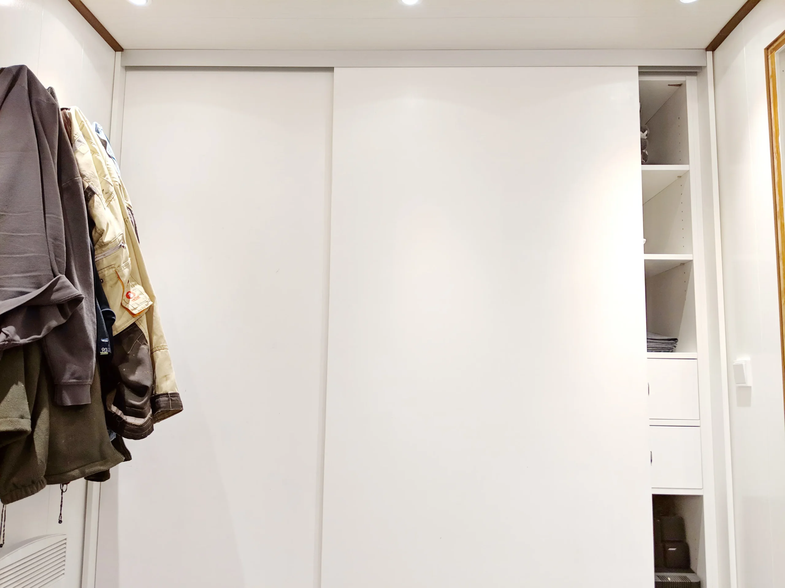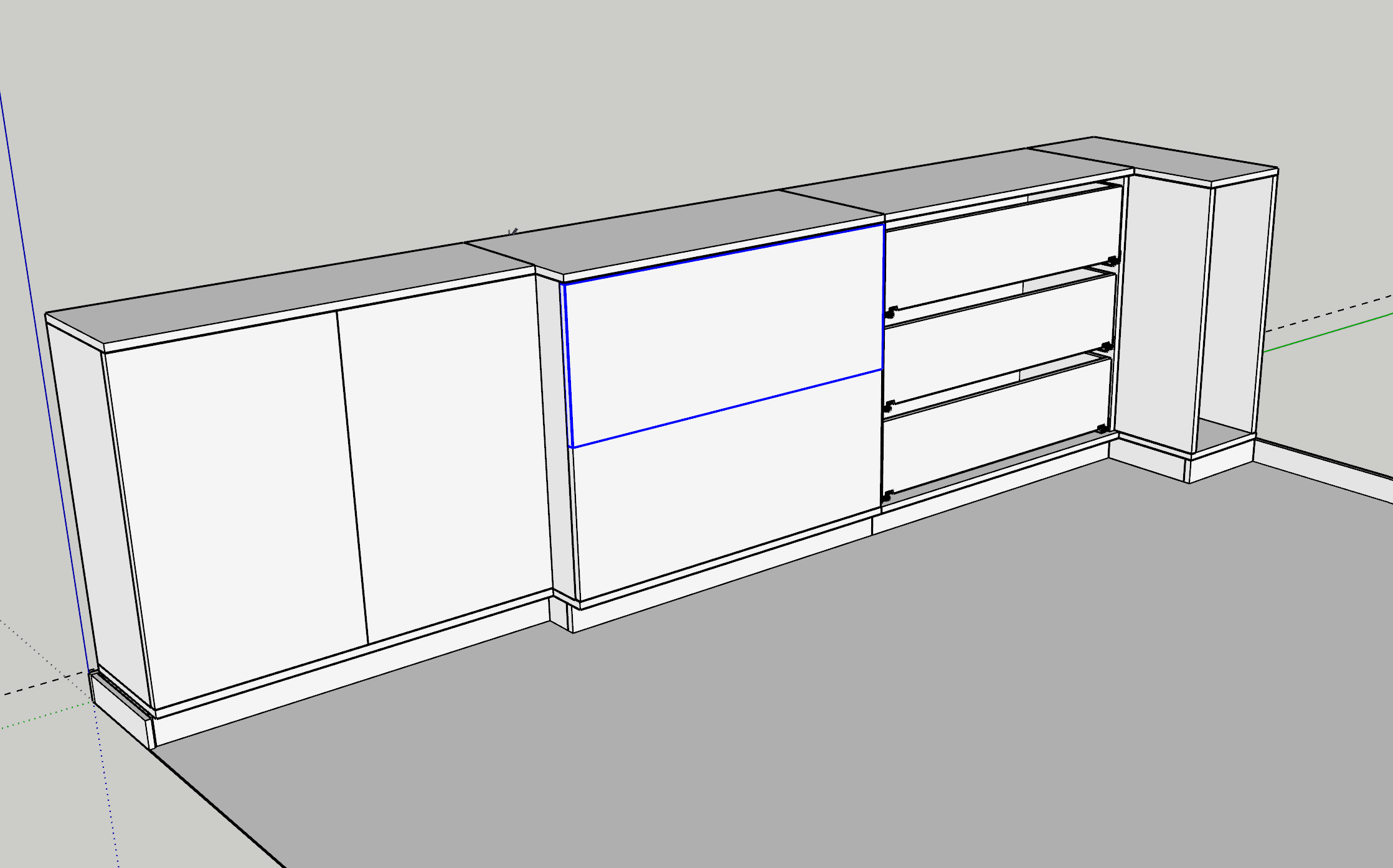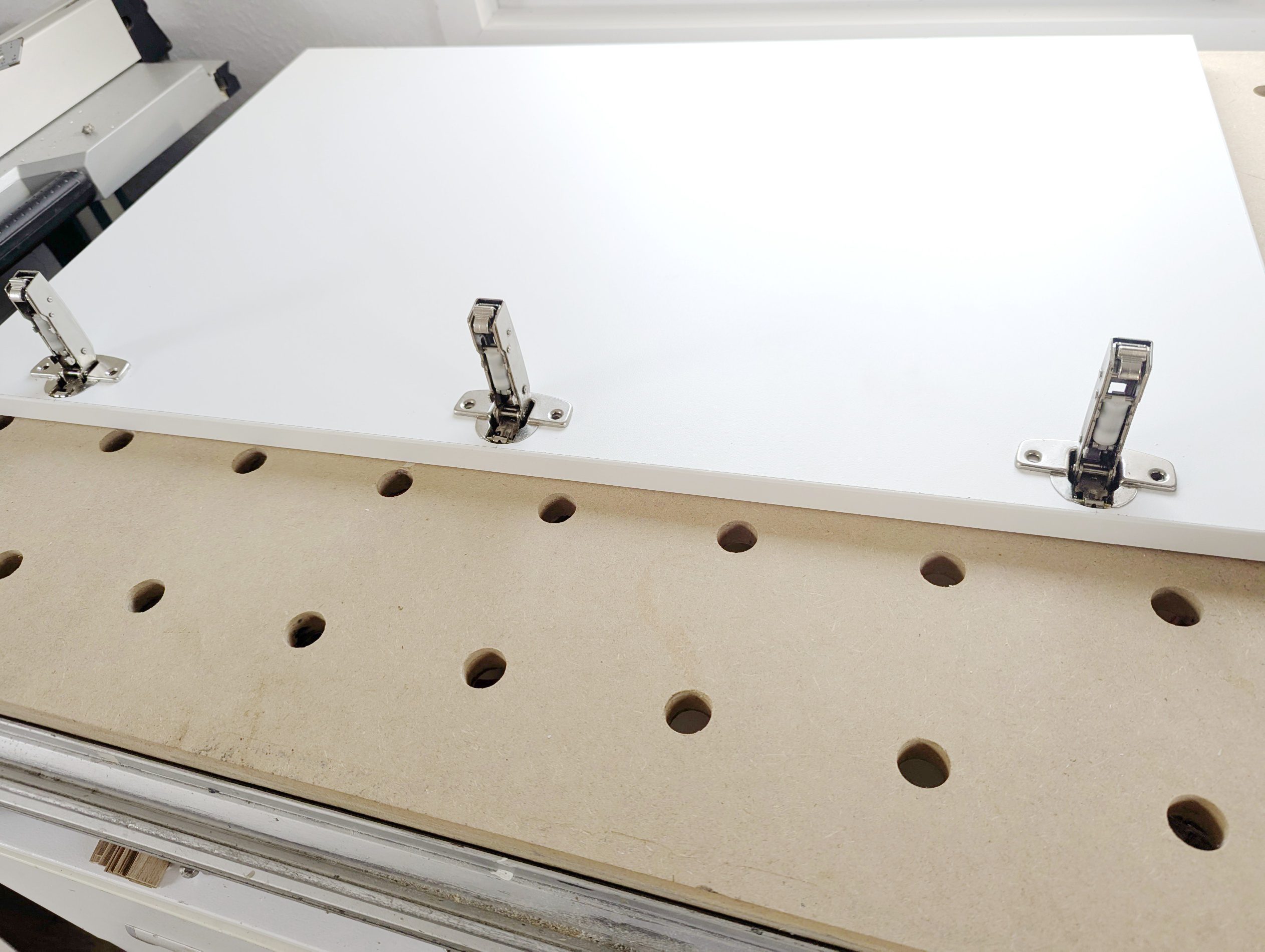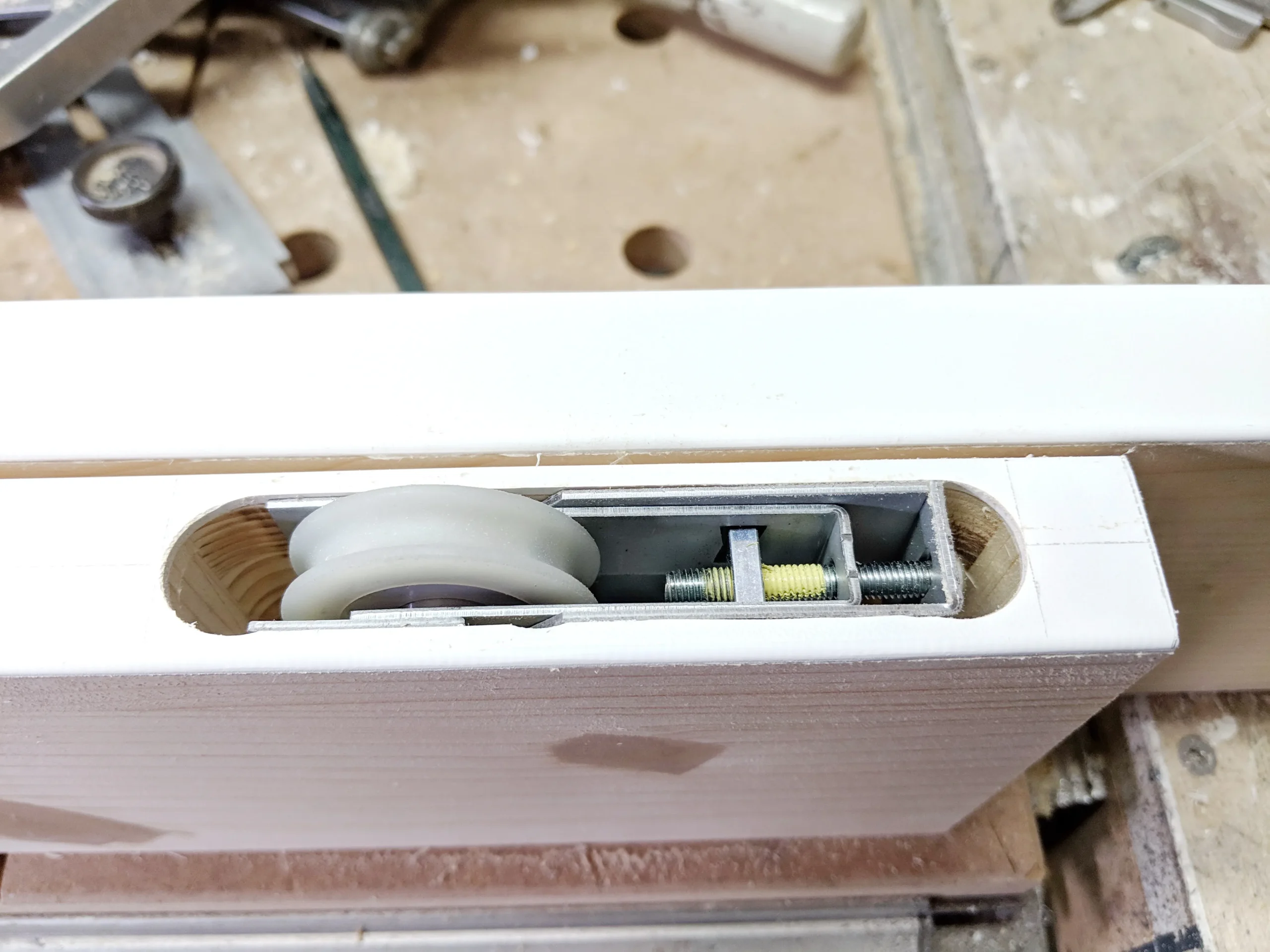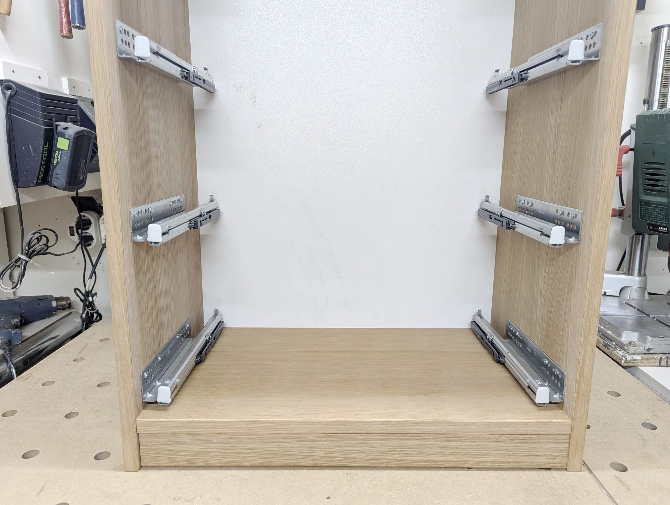 Der Schrank wird 2 Schiebtüren mit Bügelgriffen haben und Rollen mit Schienen von Hettich. Das sind sehr preisgünstige Beschläge.