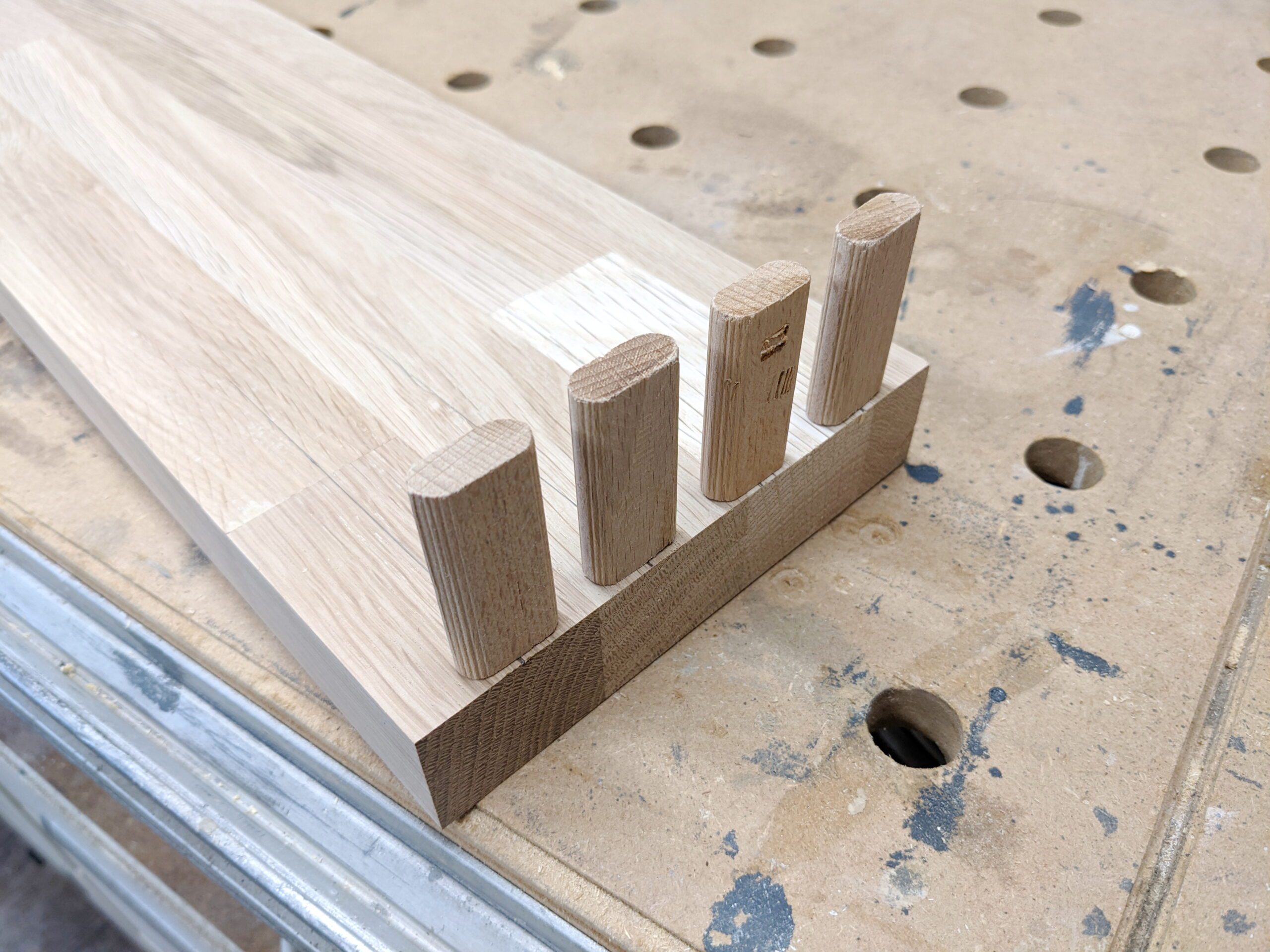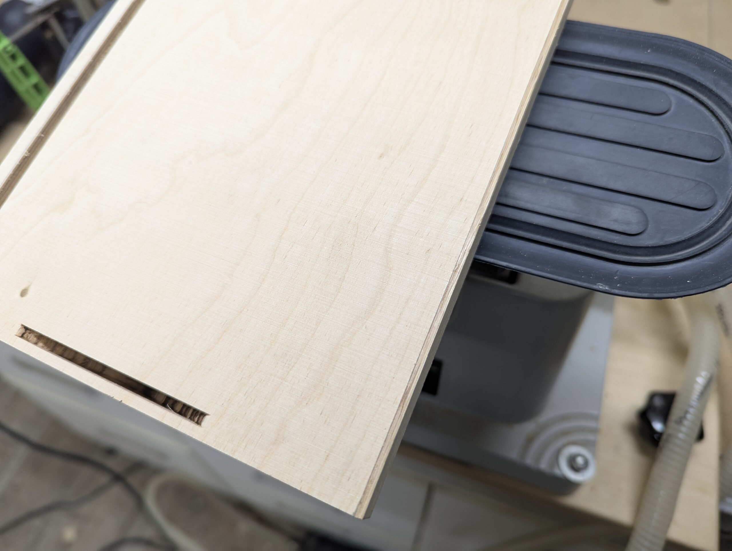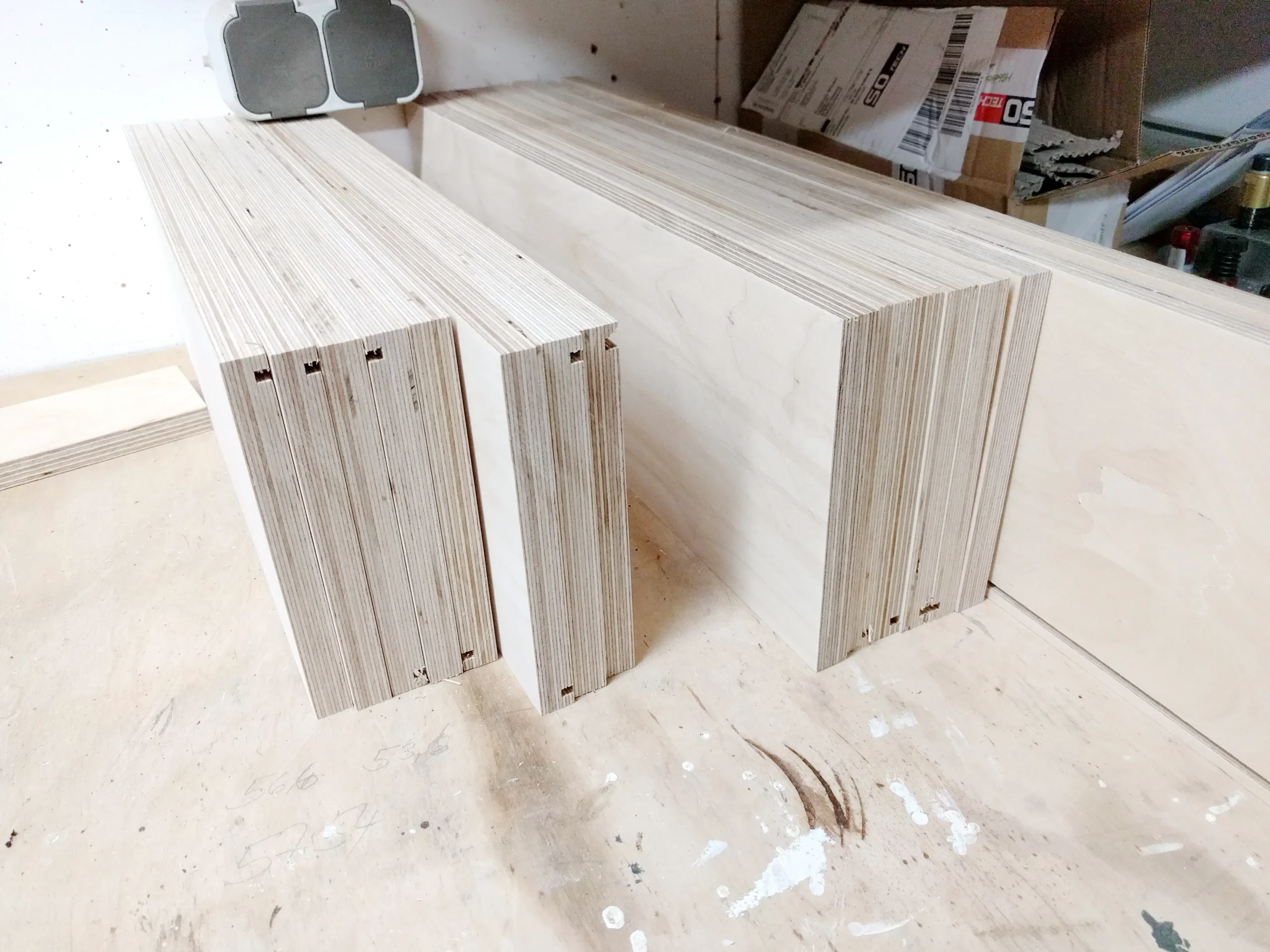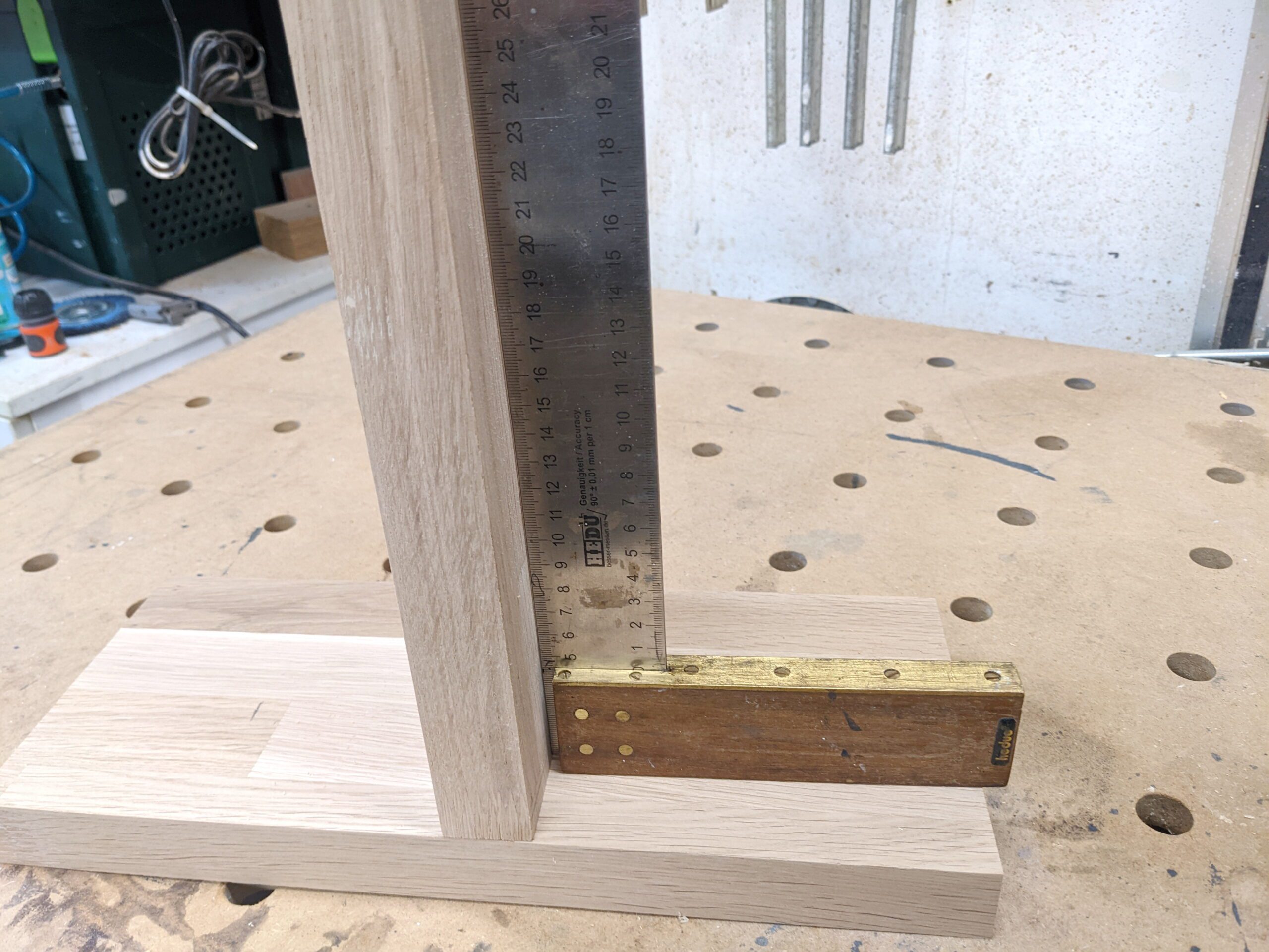 Die Stücke habe ich auf dem MFT mit Schiene und Tauchsäge zugeschnitten. Die Schnitte sind sehr sauber und ohne Ausrisse. Die Kantendicke ist im Maß berücksichtigt.