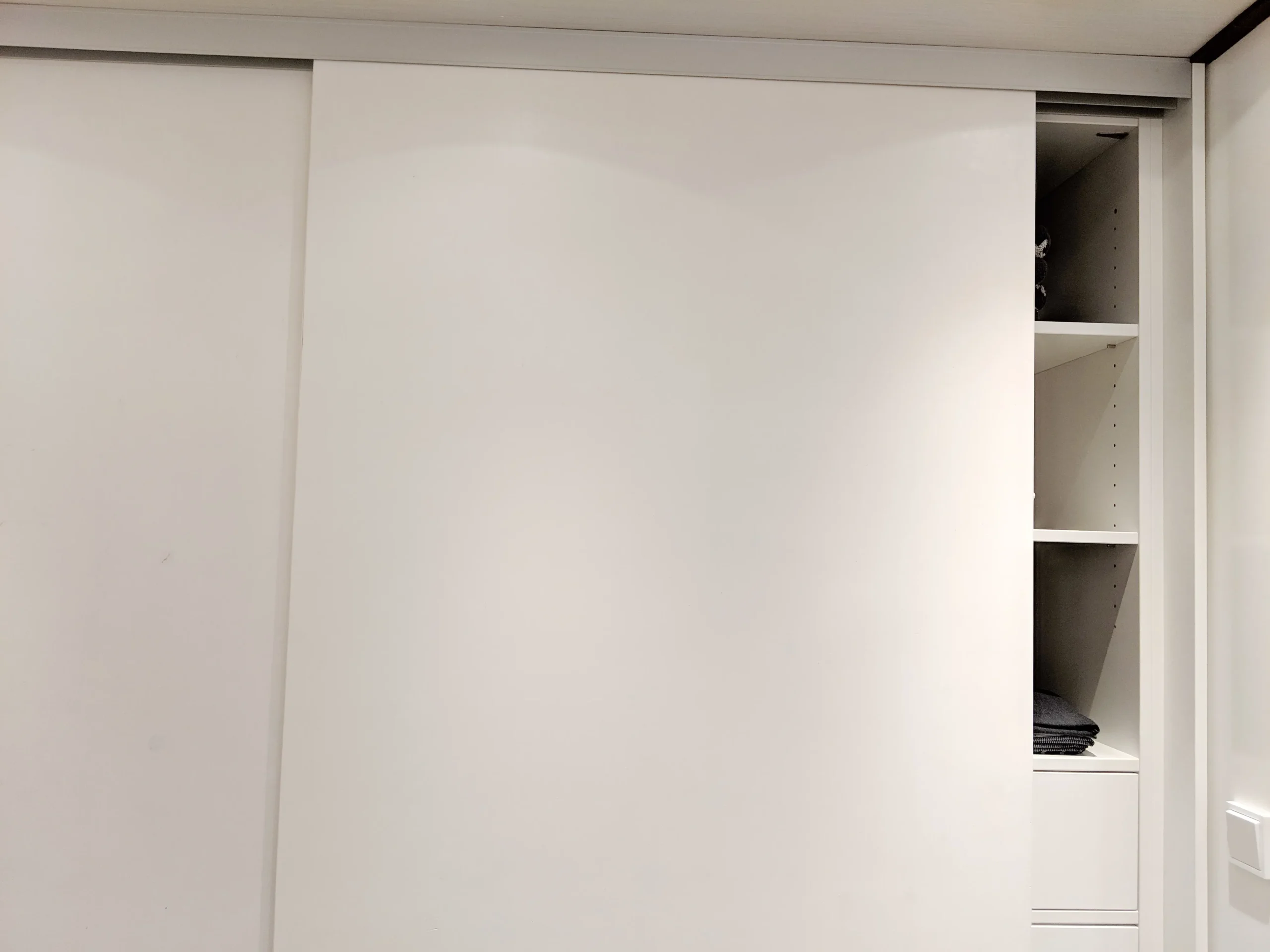 Die Schiebetüren werden eingesetzt mittels Federzug hinter der Tür. Der Führungsriegel wird nach unten gezogen und die Tür kann dann in die obere Schiene eingeführt werden. Das ist alles.