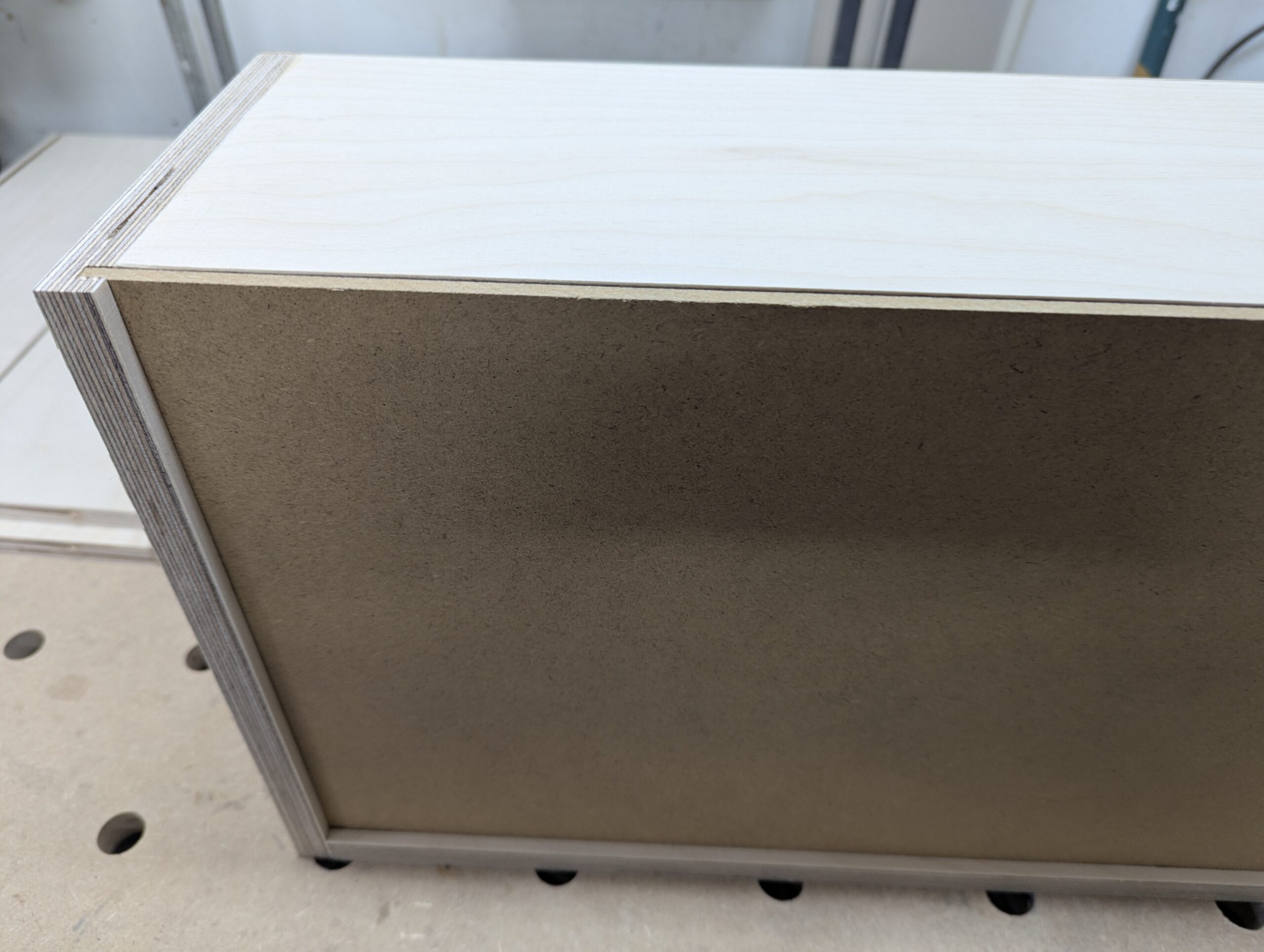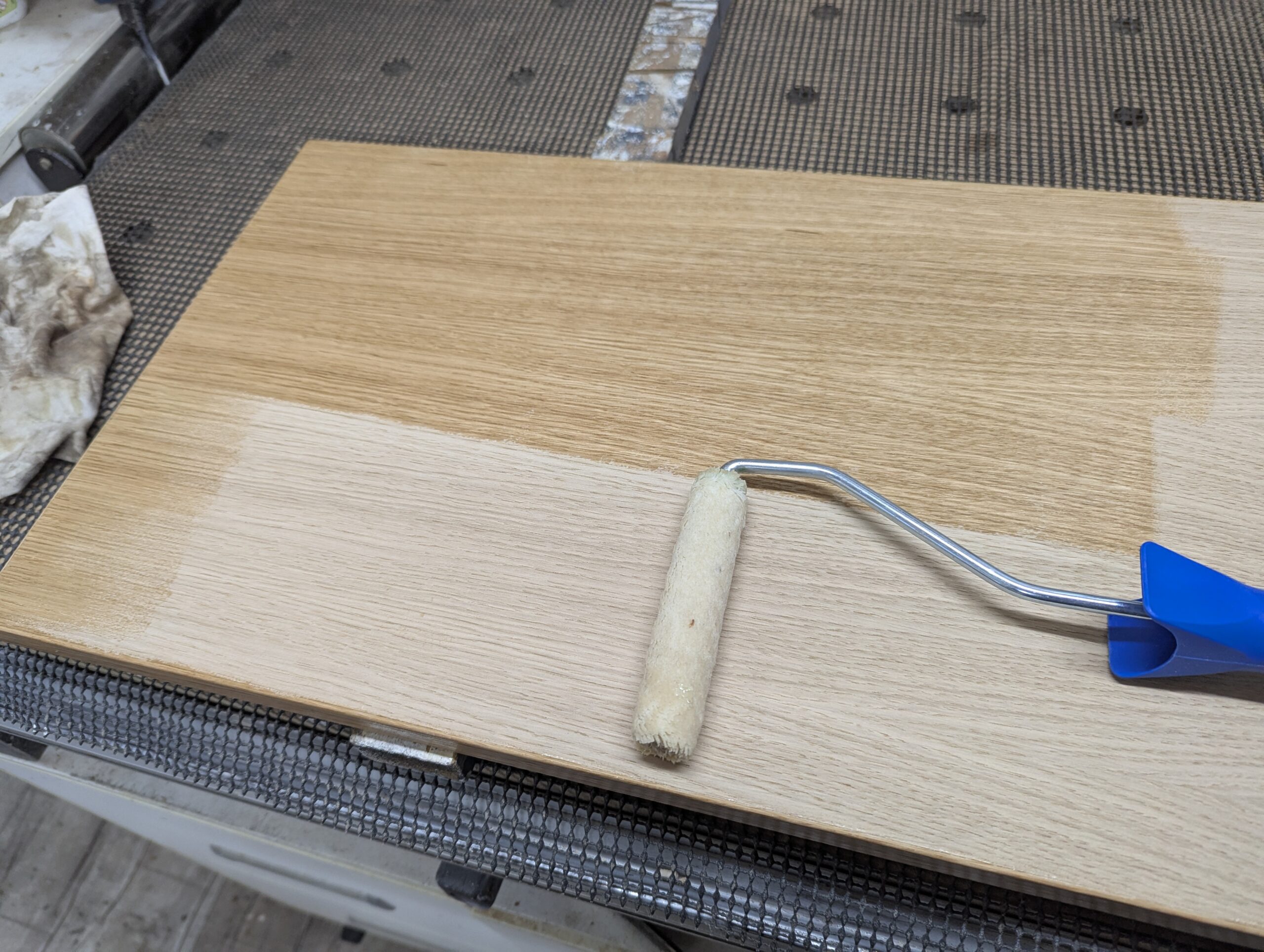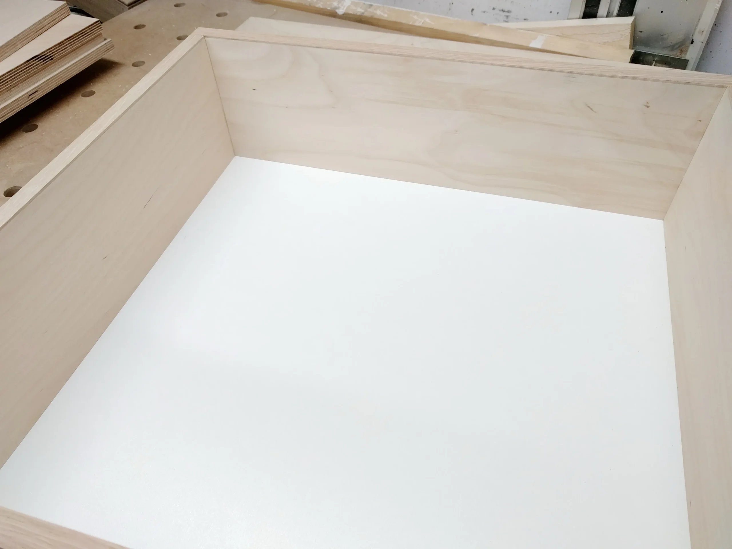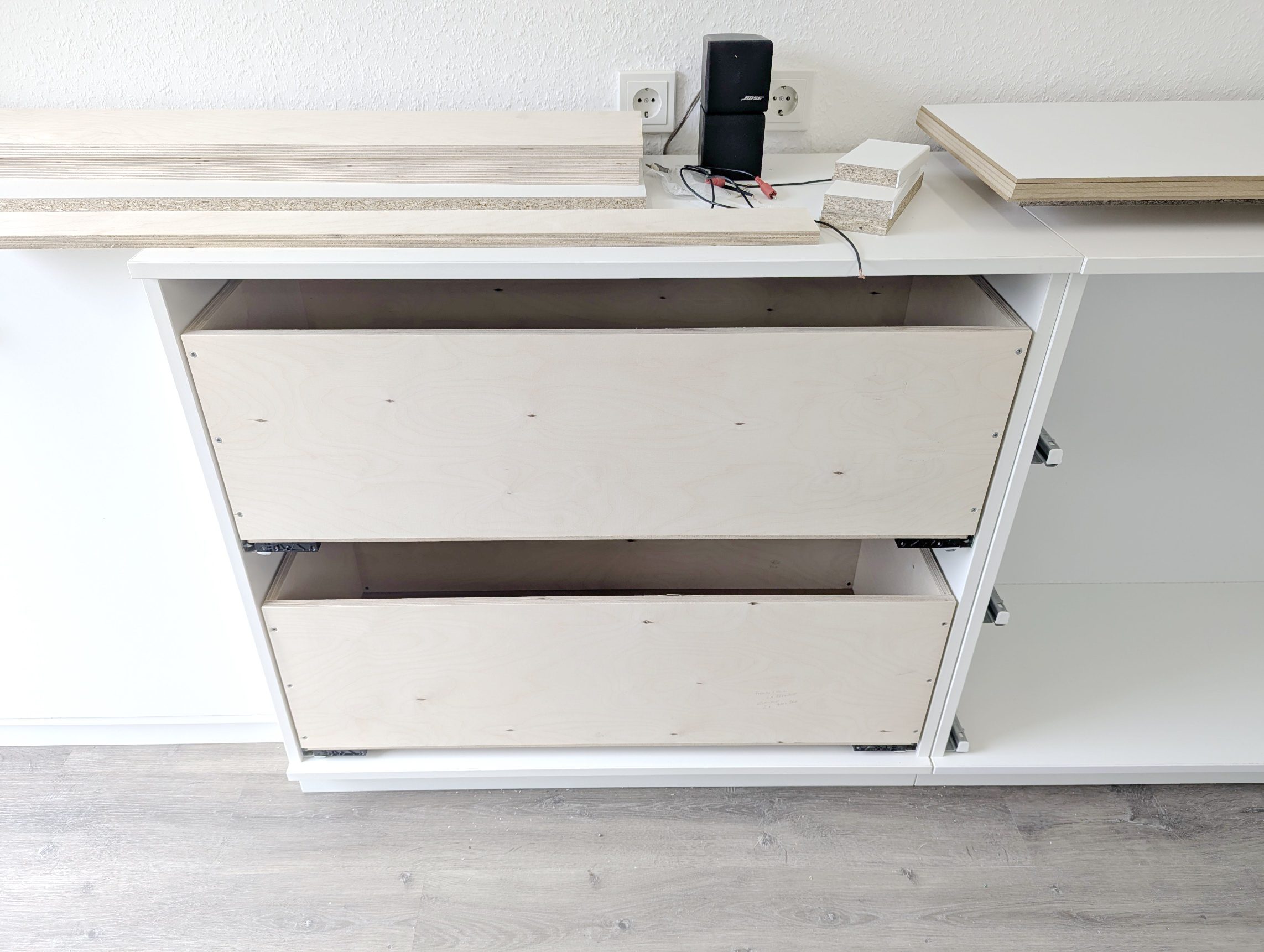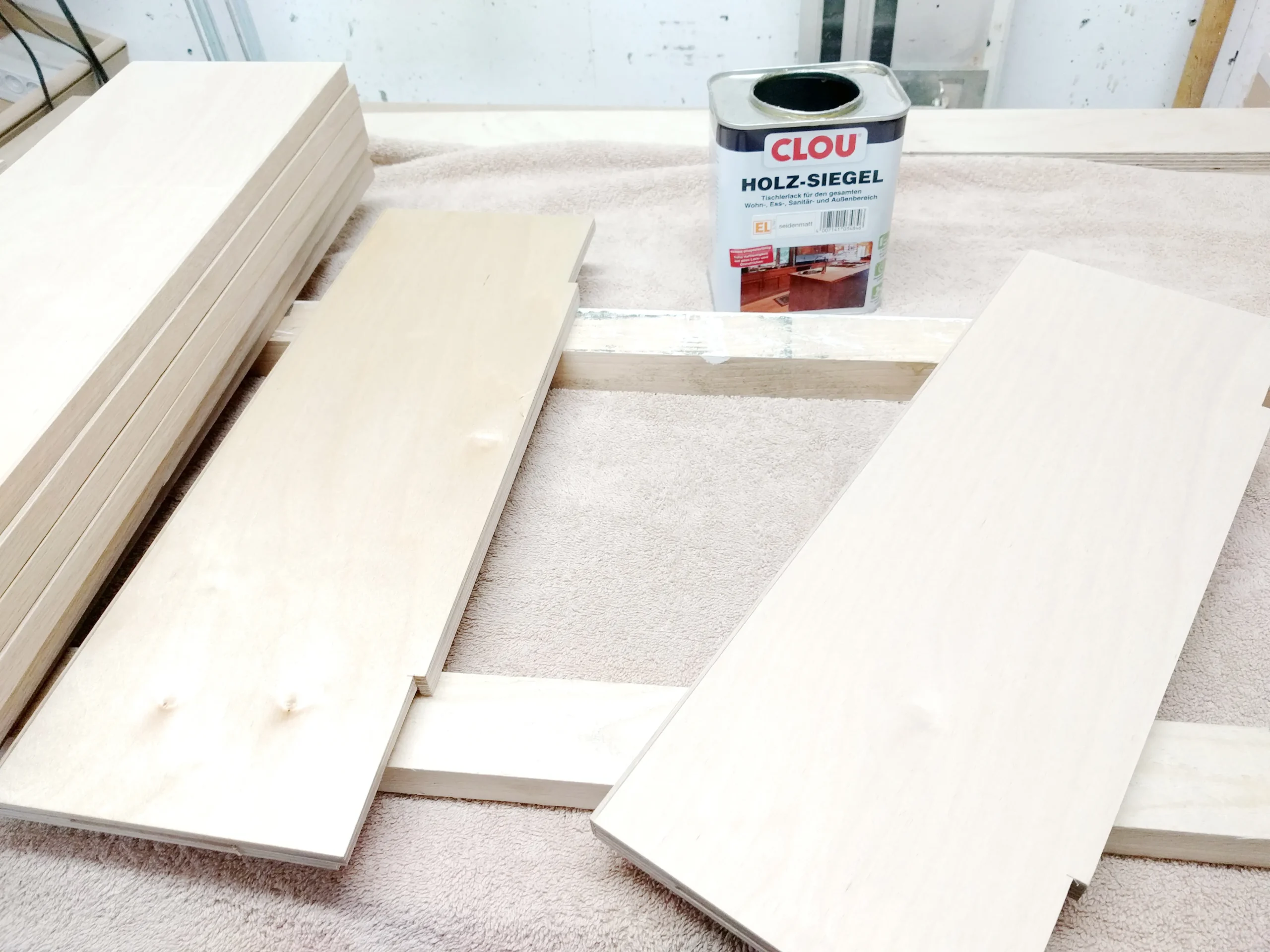 Dass es sich hierbei um furnierte Platten handelt ist nebensächlich. Zumal ich das Holz anschließend noch behandeln muss. Eine Holzoberfläche zieht den Stau richtig an und genau das will ich ja nicht. Der Schrank soll abwaschbar sein. Also werde ich das Holz lackieren.