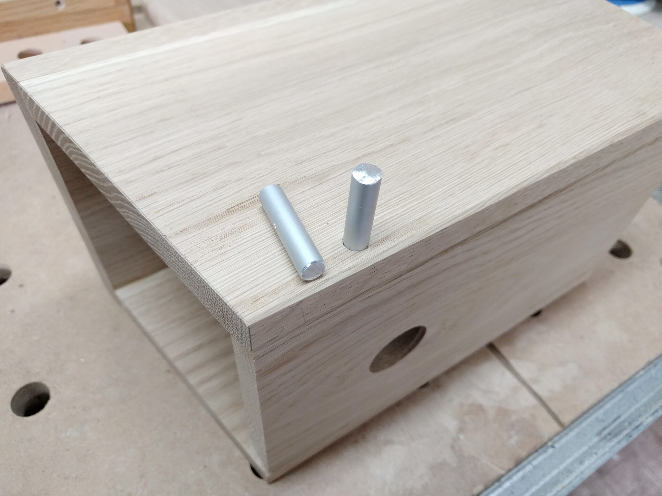 Deshalb muss die Klappe gesichert werden. Hier kann man einen Nagel oder eine Schraube verwenden. Um die Klappe jedoch ohne Werkzeug öffnen zu können, ist ein einfacher Haken sehr praktisch: Ein 4 mm Aluminium-Rundstab wird gebogen und in ein vorgebohrtes Loch gesteckt.