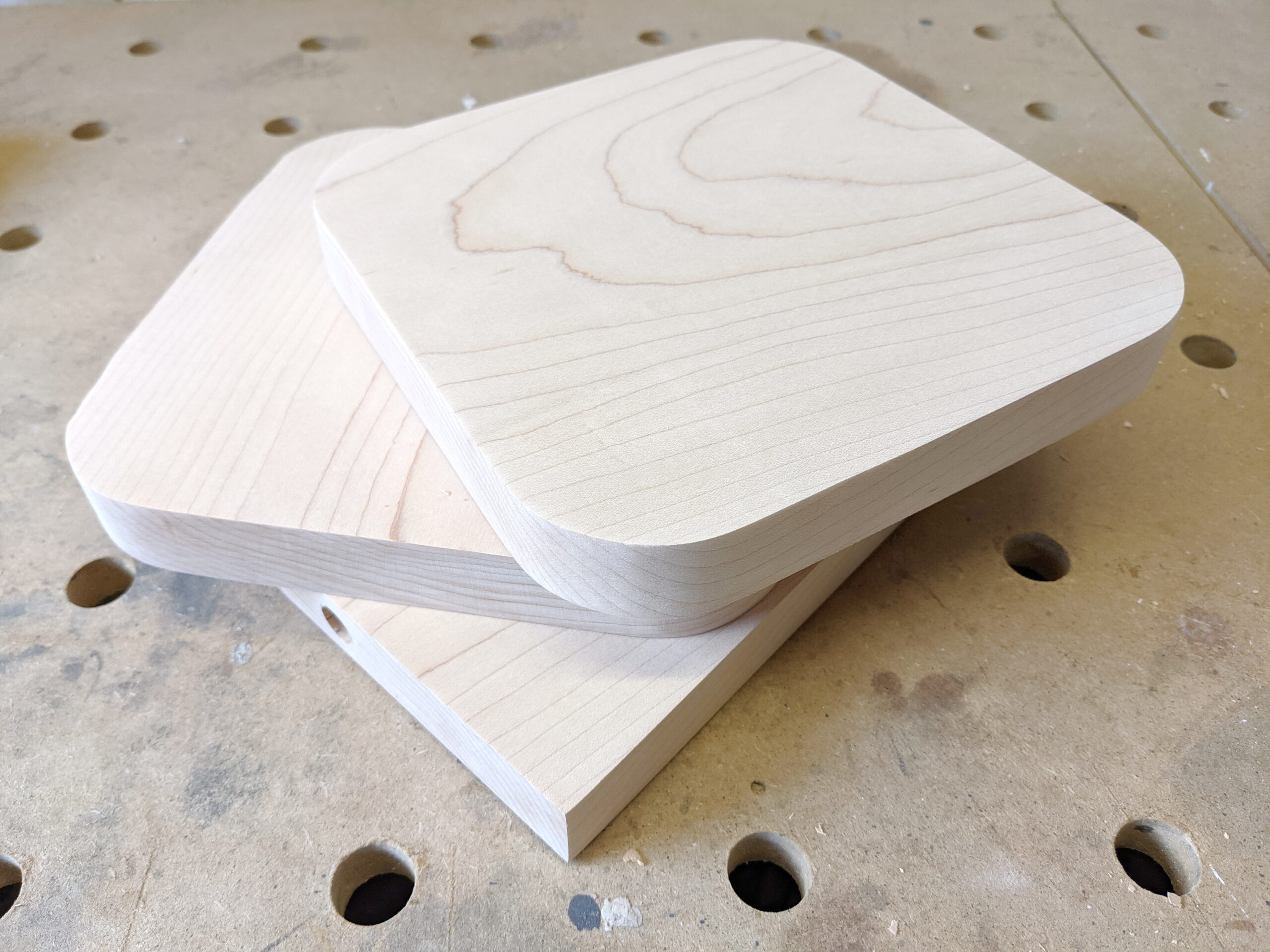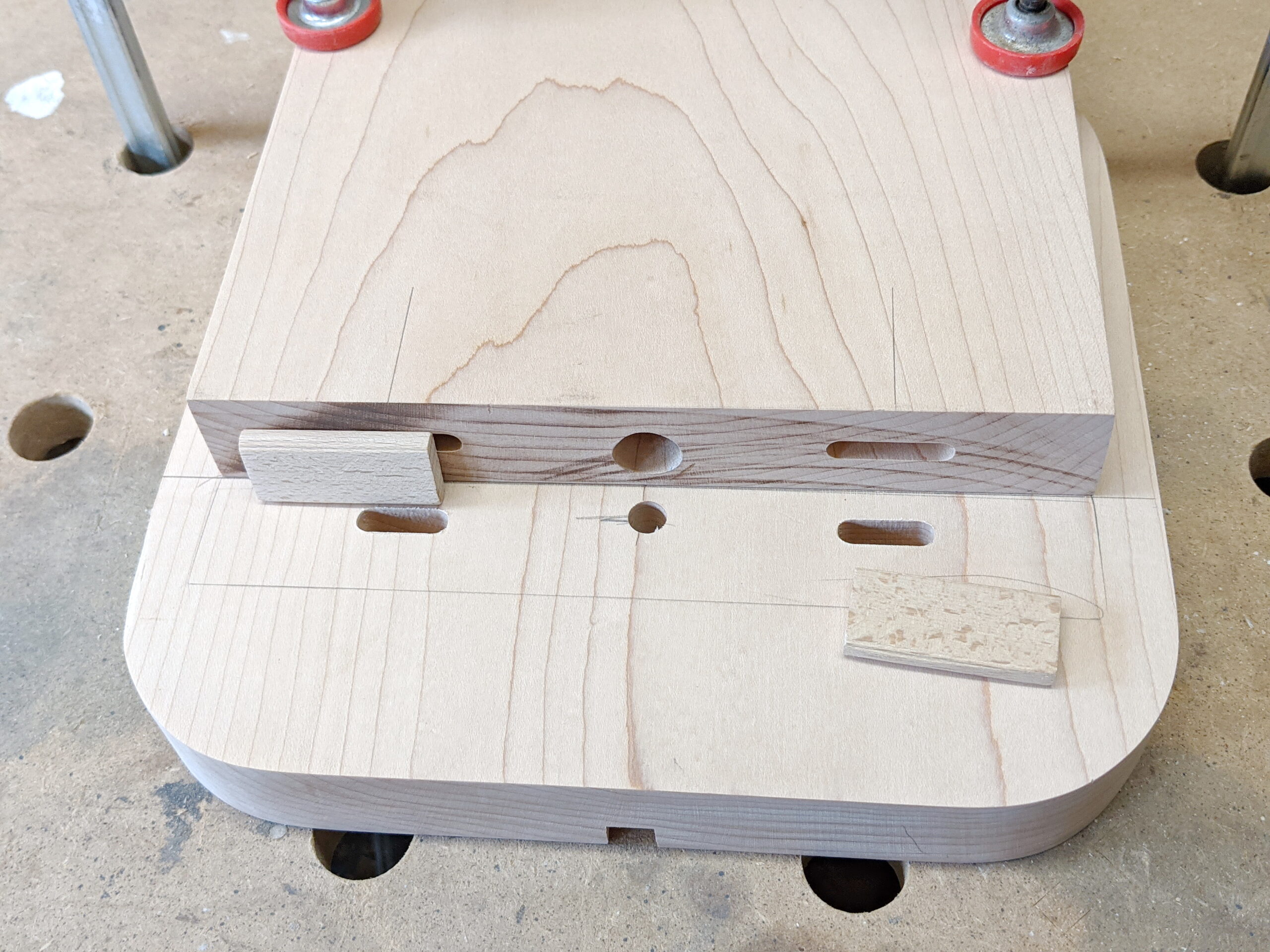 Vom Wohnzimmertisch hatte ich noch ausreichend Ahorn-Vollholz übrig. Nicht, weil ich falsch kalkuliert hätte, sondern weil dieses Holz als Rohware in zu verarbeitende Stücke geschnitten wurde. Das Leimholz habe ich anschließend selbst hergestellt.
