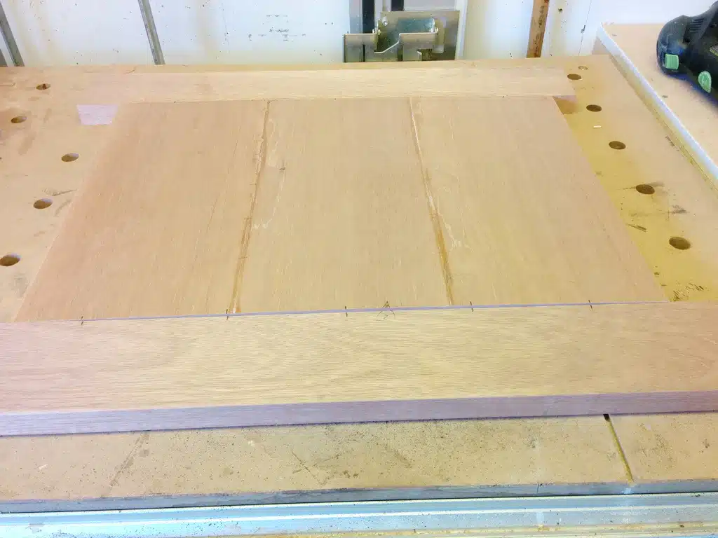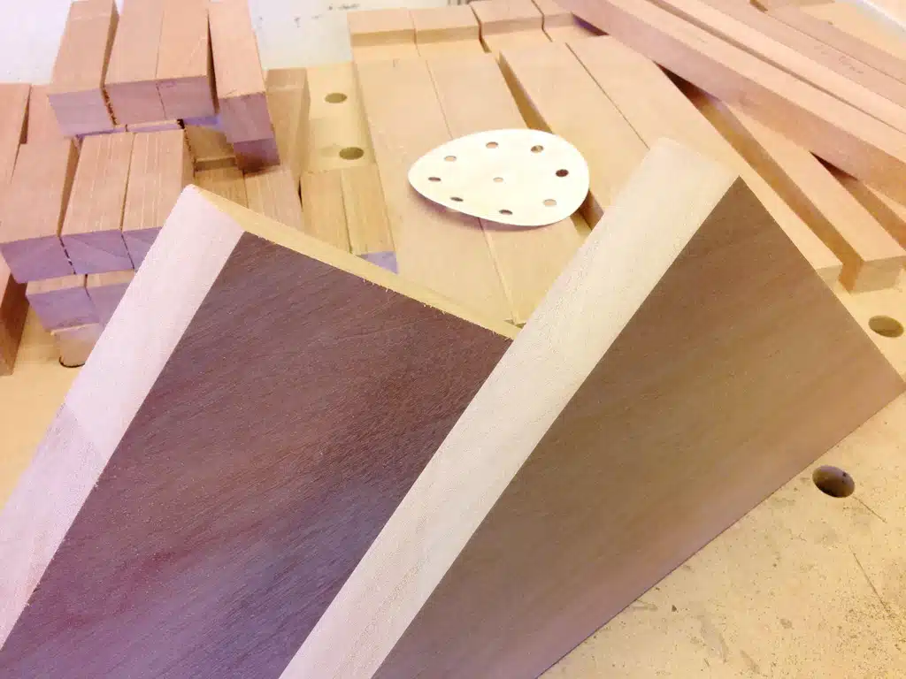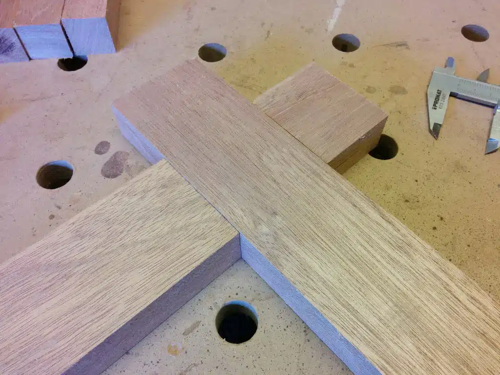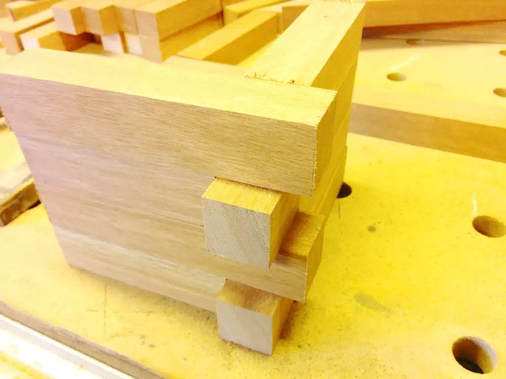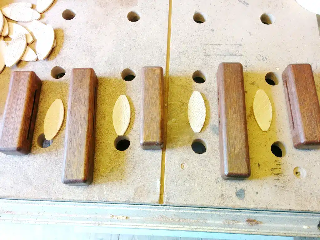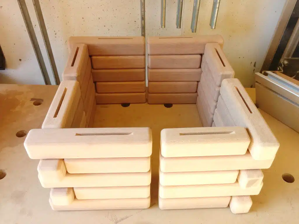 Ja, das ist eine echte Fleißaufgabe – oder wie man sagt: eine Arbeit für jemanden, der sonst nichts vorhat. Aber für ein perfektes Endergebnis führt daran kein Weg vorbei! Verbunden werden die ‚Klötzchen‘ übrigens mit Lamellos. Im Vergleich zu den Festool Dominos sind Flachdübel hier spottbillig und erfüllen bei diesem Rahmen absolut denselben Zweck.