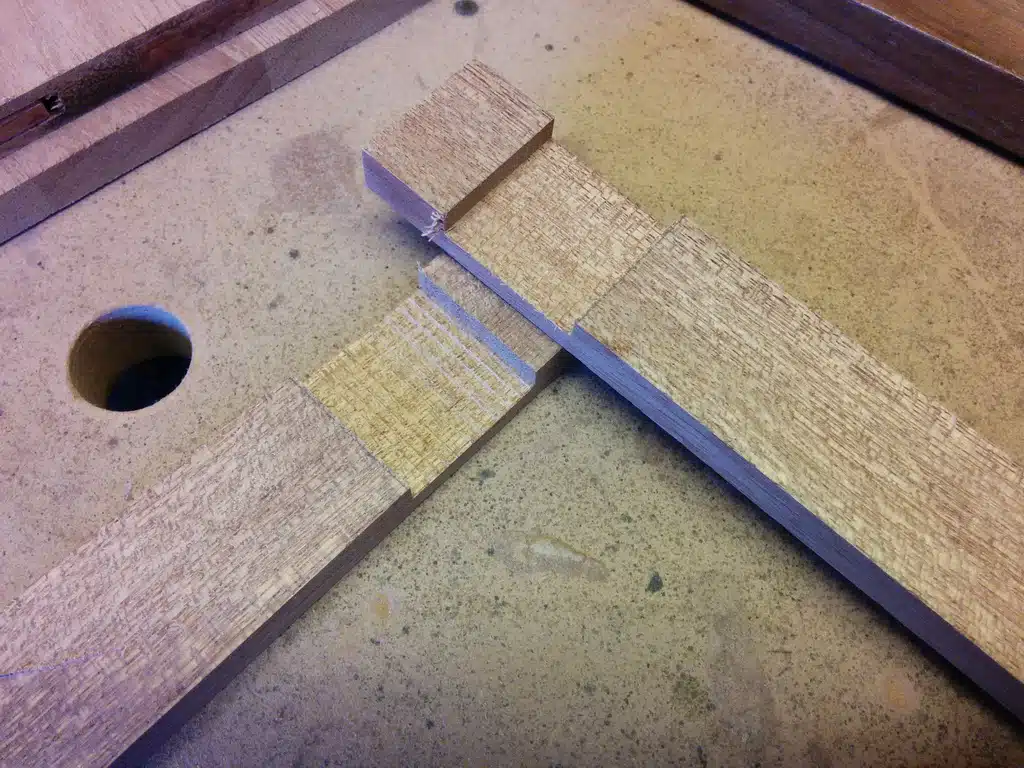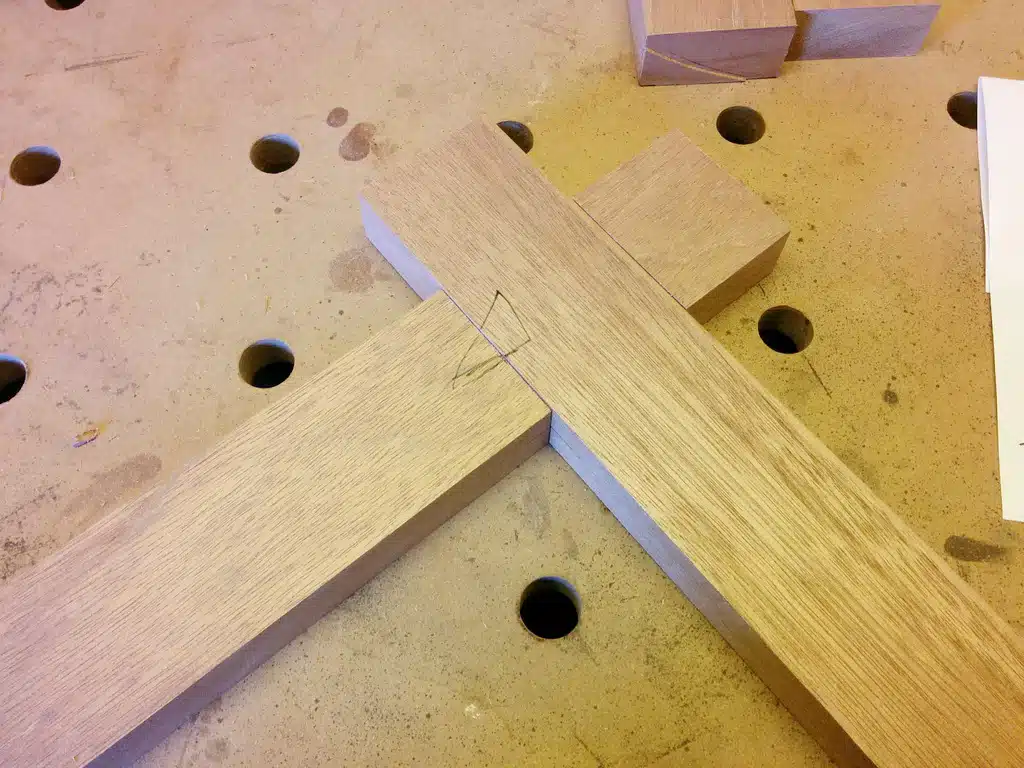 Die Holzverbindungen habe ich durch sauberes Ausklinken der Werkstücke gelöst. Mit der Festool KS 120 ist das dank der integrierten Schnitttiefenbegrenzung sehr komfortabel: Man setzt einfach Schnitt an Schnitt in Sägeblattbreite, bis die Aussparung passt. Die feine Nacharbeit an den Flächen erfolgte dann ganz klassisch mit dem Stechbeitel.
