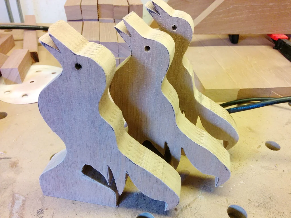 Auf zunächst Papier übertragen habe ich den Umriss auf das Meranti aufgebracht und auf der Dekupiersäge ausgeschnitten.