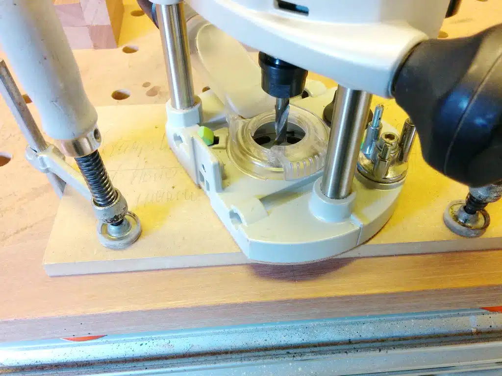 Beim Standfuß hatte ich Glück: Ich konnte beim Holzhändler ein passendes Meranti-Kantel finden, was mir die Eigenherstellung von Leimholz erspart hat. Den Ständer habe ich auf eine Höhe von 900 mm abgelängt, mit DOMINO-Fräsungen versehen, geschliffen und die Kanten stationär auf dem Frästisch abgerundet.