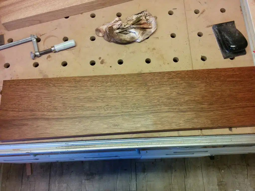 Der Haken an der Sache: Meranti ist vergleichsweise teuer, und gerade dicke Dimensionen sind schwer zu finden. Für mein Projekt habe ich 27 × 145 mm Balkonbretter verwendet. Ein kleines Ärgernis waren dabei die bereits abgerundeten Kanten – für den Leimholzbau musste ich daher seitlich jeweils 5 mm abtrennen. Ein wichtiger Tipp noch: Achtet auf die Dichte! Zwischen „leichtem“ und „schwerem“ Meranti gibt es deutliche Unterschiede bei der Stabilität und Verarbeitung.
