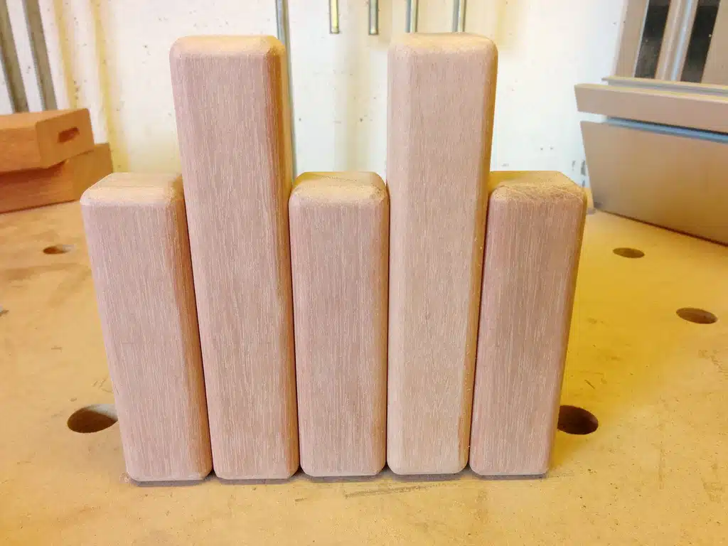 Vor dem Ablängen habe ich die Ecken mit der Oberfräse abgerundet. Jetzt erst ablängen und schon war der erste Satz der Schindeln fertig.