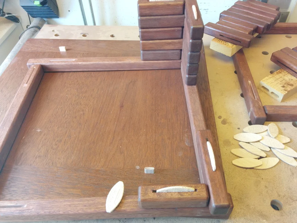 Zuerst ist der Boden an der Reihe. Die Merantibretter habe ich bereits besäumt, abgelängt und gehobelt. Für die Verbindung setze ich auf DOMINOS – das gibt ordentlich Stabilität. Damit die Platte später nicht schüsselt, habe ich Stirnbretter als Gratleisten-Ersatz montiert.