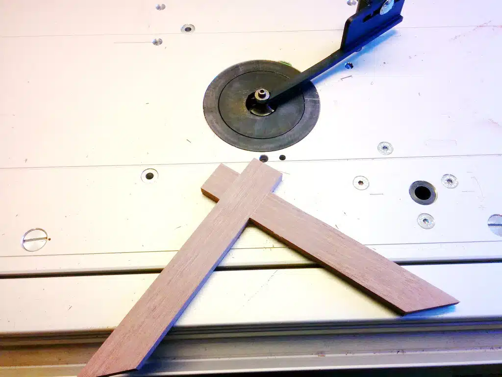 Deutlich aufwendiger war die Konstruktion des oberen Kreuzes und des Fußkreuzes. Die seitlichen Stützen im oberen Bereich habe ich klassisch auf der Dekupiersäge zugeschnitten; die entsprechenden Aussparungen wurden präzise mithilfe einer Frässchablone gefertigt.