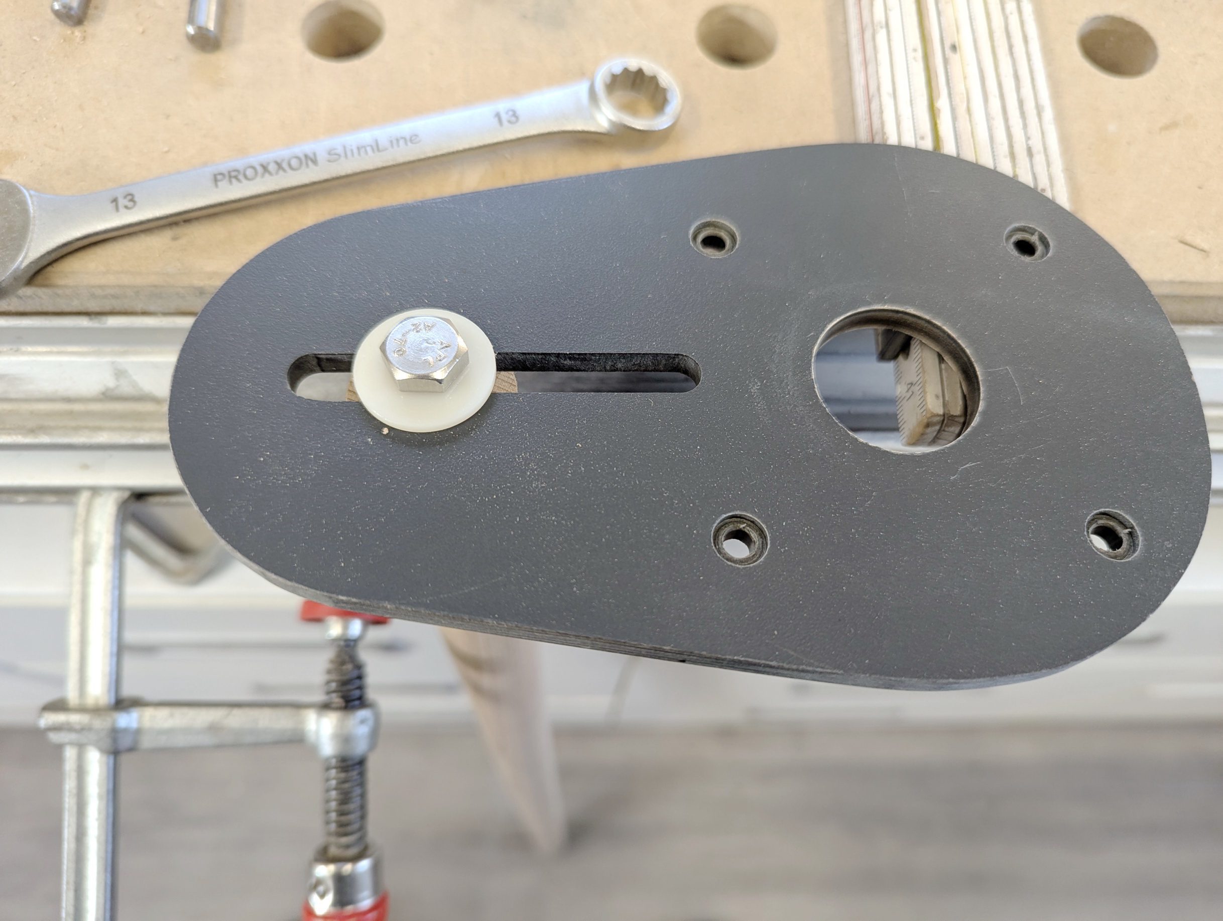 Die Grundplatte muss nicht unbedingt ein Langloch für eine Verstellung haben, wenn nur eine bestimmte Oberfräse eingesetzt wird.