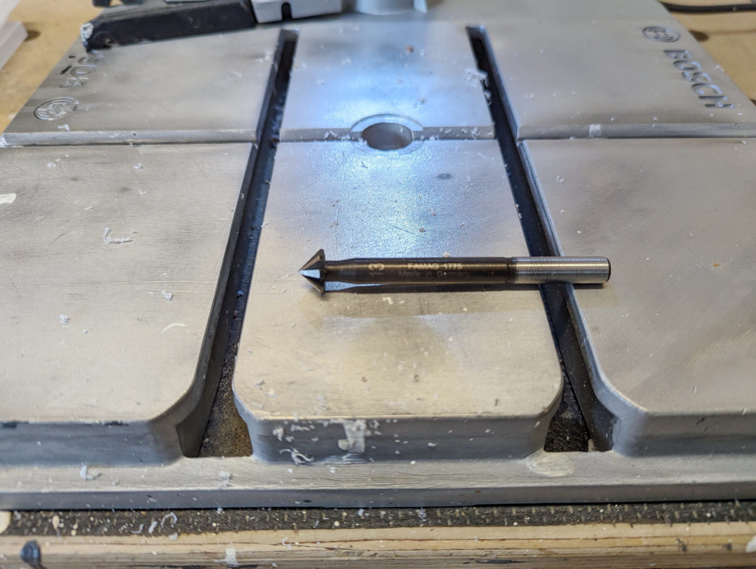 Problem bei den Senkungen der Bohrungen zuvor war, die Senkungen waren „eckig“ und unsauber. Trotz nachschärfen der Senker.