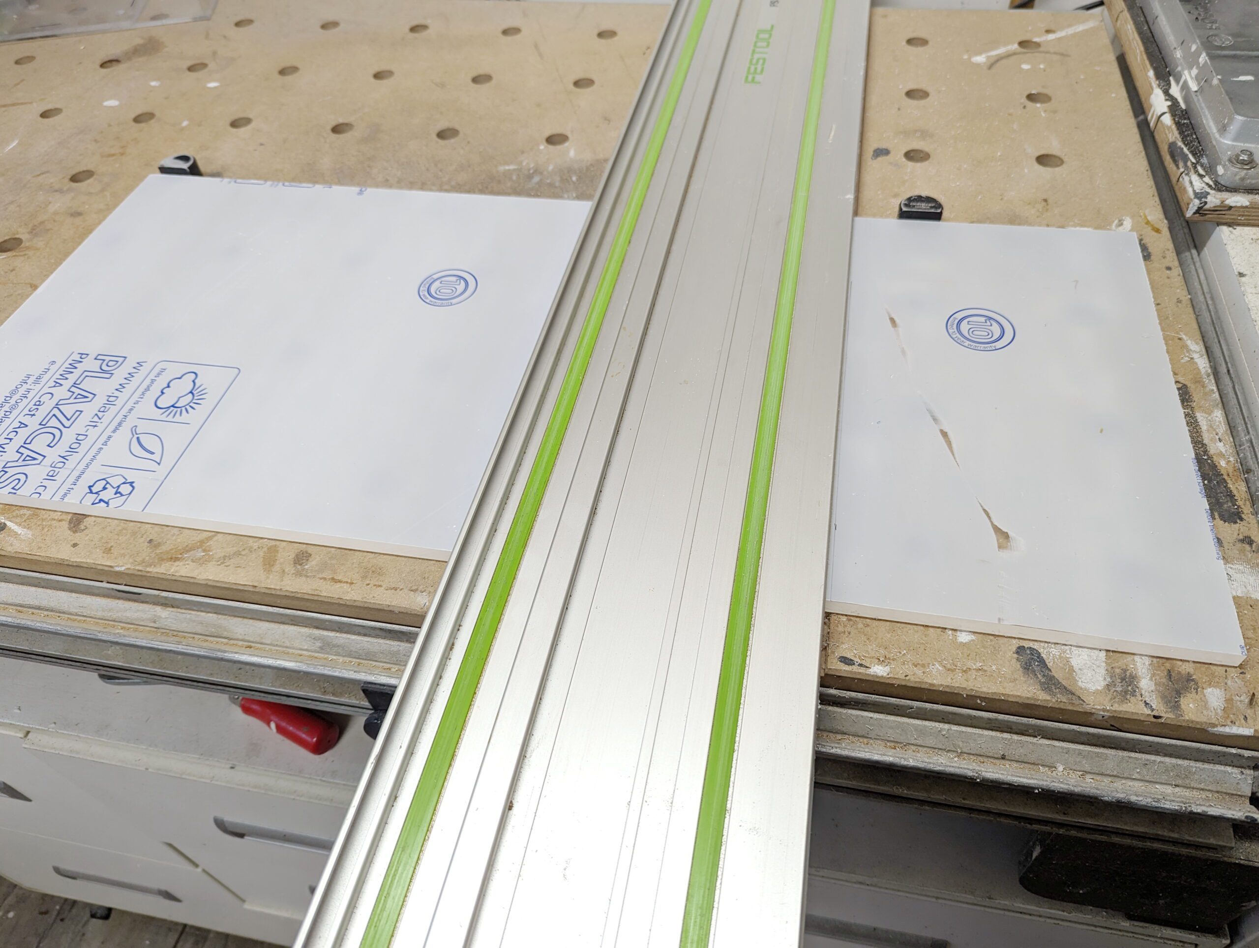 Tauchsäge TS 55 auf Drehzahl 1, einmal rückwärts über das Acrylglas gezogen und dann mit einem Schnitt getrennt.